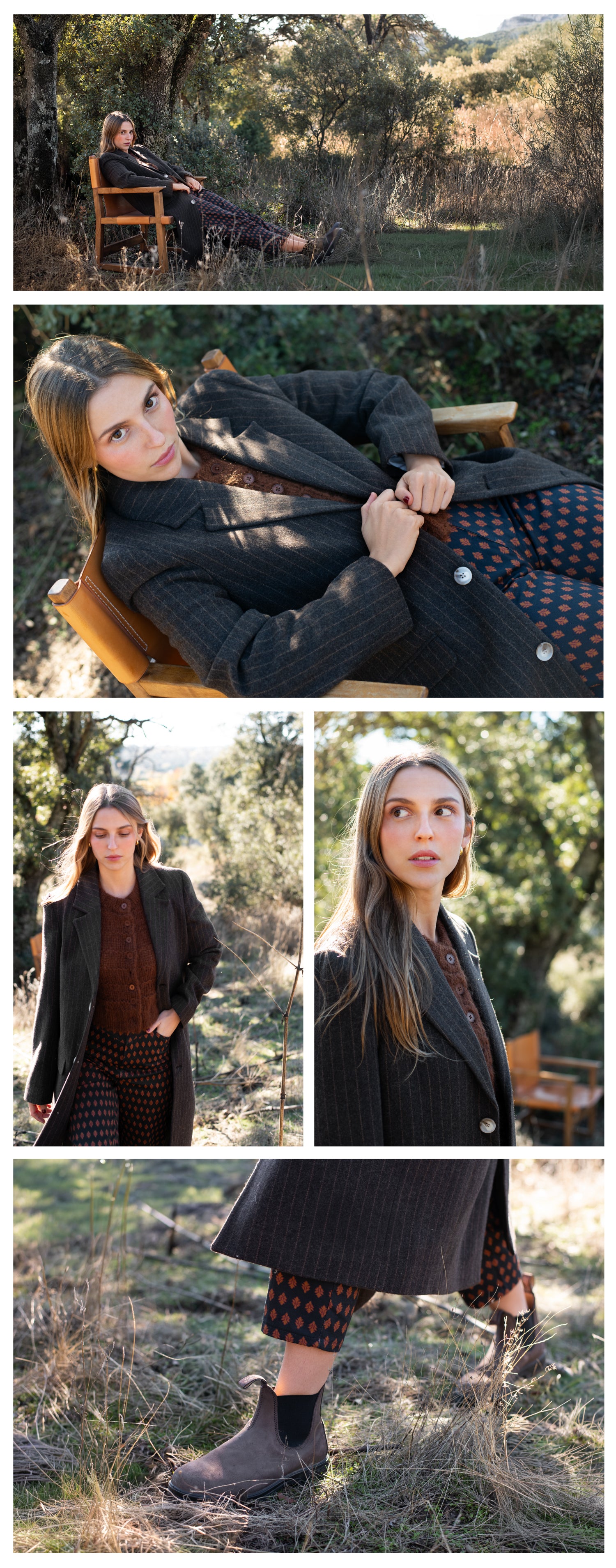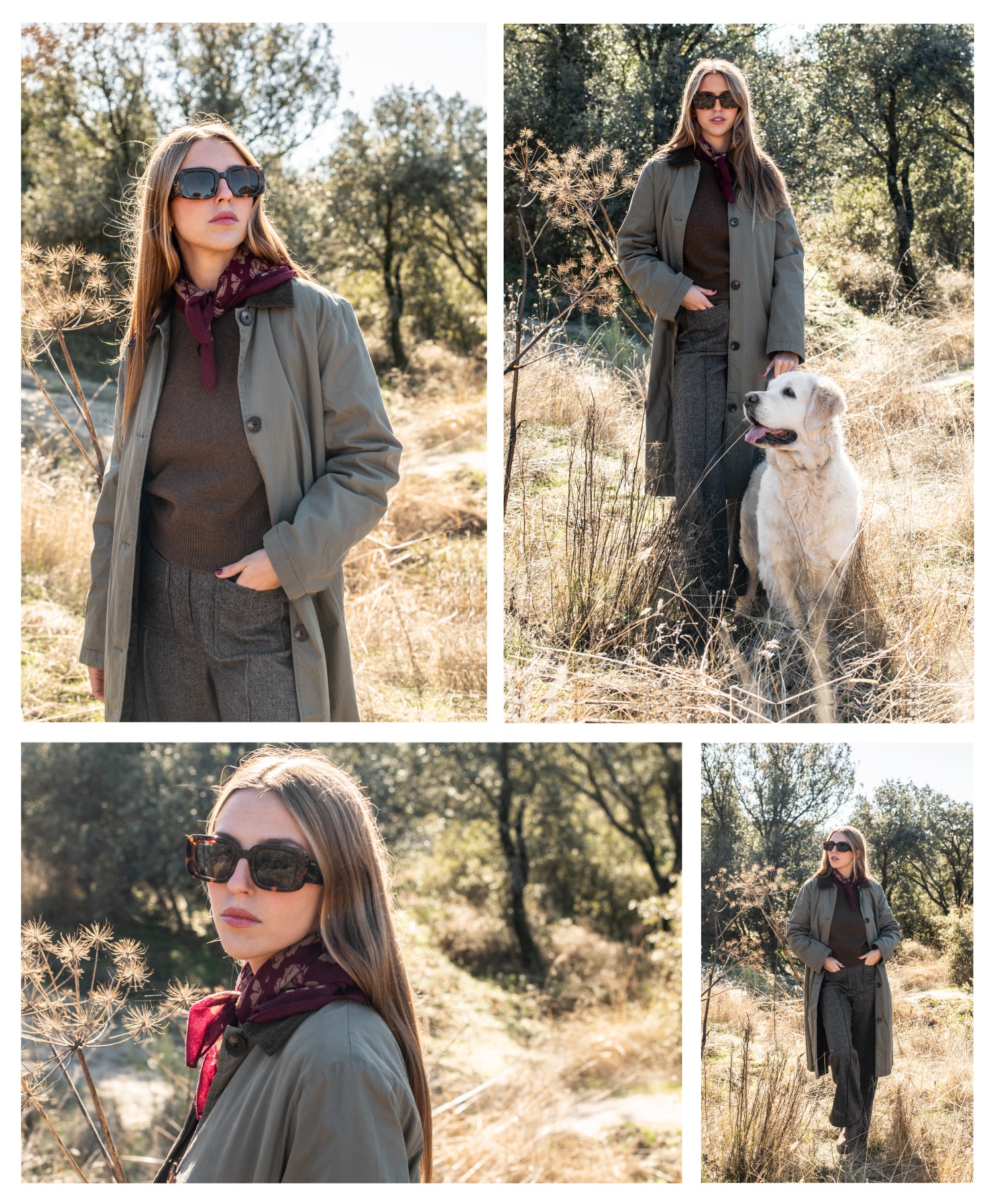 Outfit de otoño-invierno con abrigo en tonos verdes y marrones, jersey de punto marrón y pantalón de lana con estampado de espiga. El pañuelo burdeos introduce color sin romper la línea natural del conjunto.Un look pensado para caminar por el campo y moverse entre encinas con comodidad y estilo.