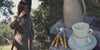 La escena la compone un look de otoño-invierno con abrigo reversible, por un lado liso y por el otro lado estampado en tonos neutros y sobre una manta de cuadros, encontramos el menaje para desayunar un café con croissants.