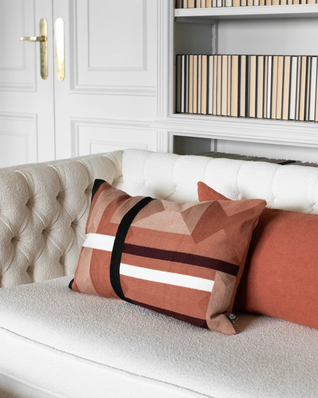 Arizona 40x60cm Haomy Cushion . Bring warmth , texture , and style to your spaces. This rectangular model in a deep tile hue stands out for its delicate geometric embroidery, which combines contemporary design with a subtle artisanal feel.
