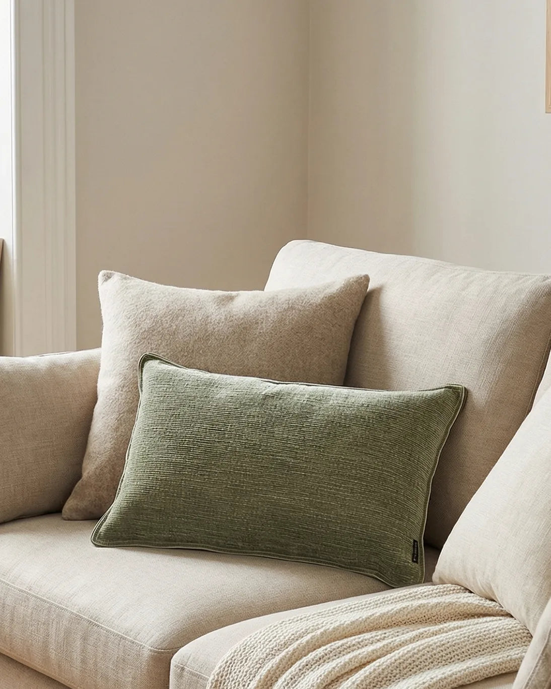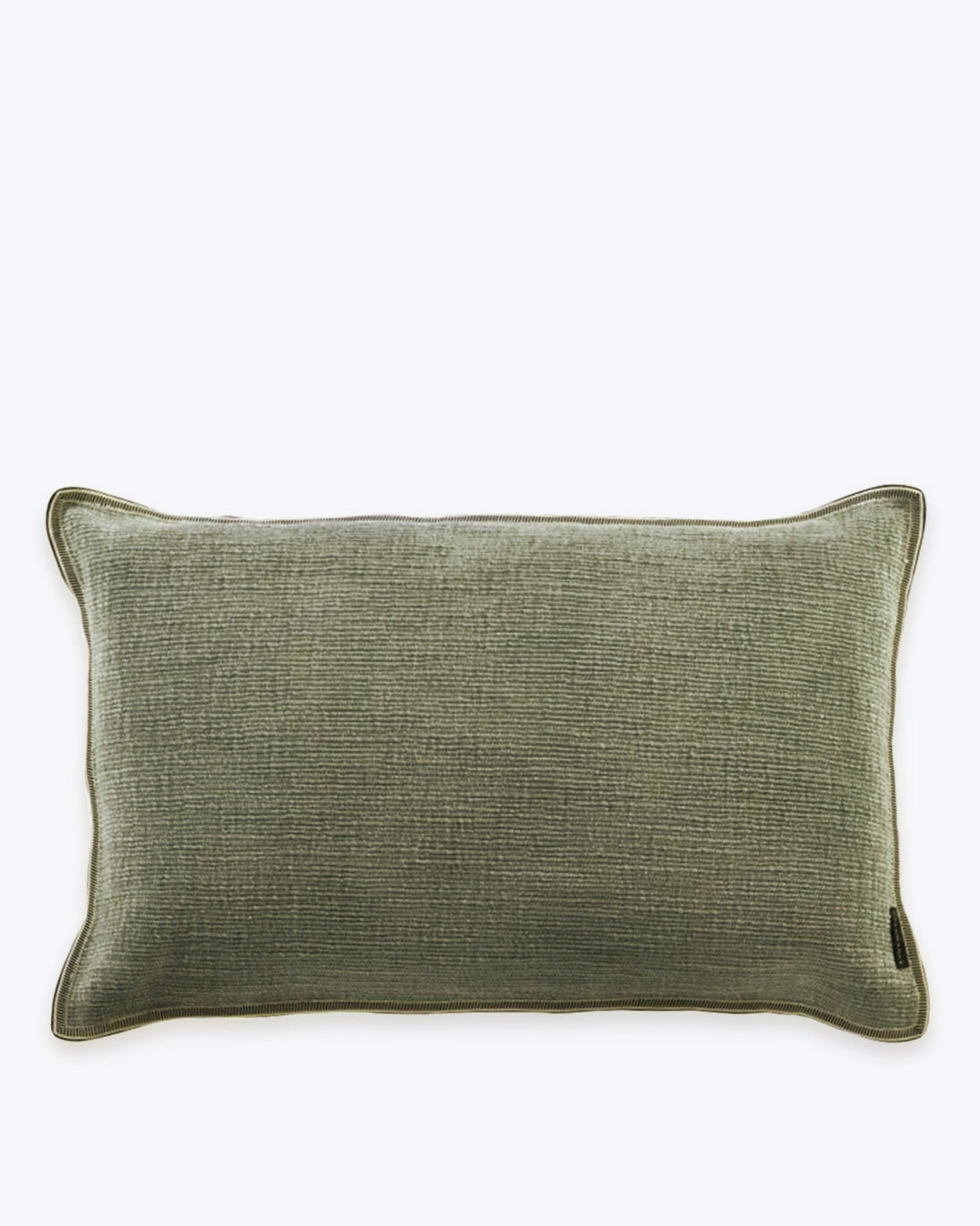 Almohadón rectangular de color verde caqui de doble faz, con un ribete con rayitas negras. La cara delantera es de un tejido tipo bouclé, y la trasera de lino, ambas del mismo color.