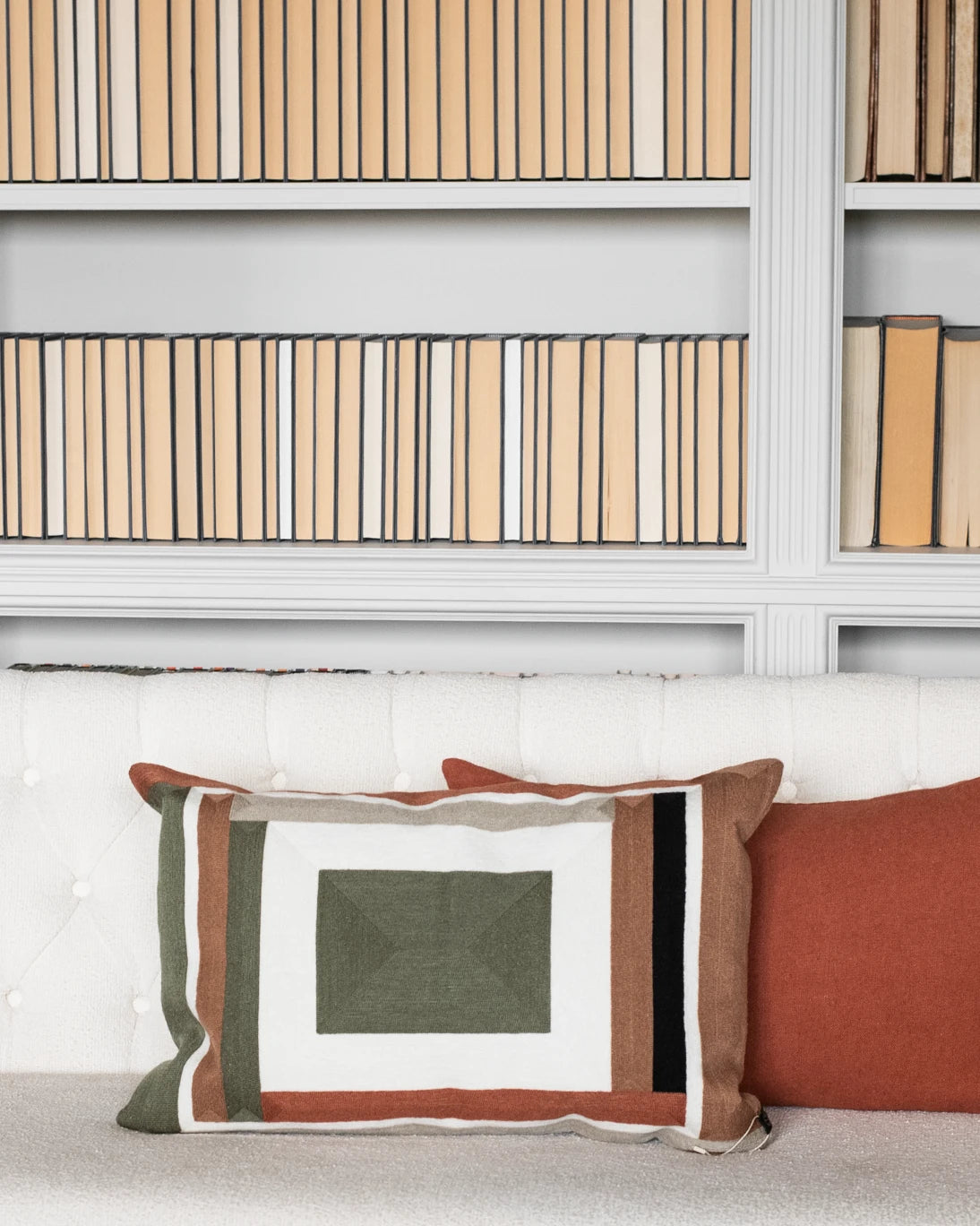 Manille cushion with a geometric motif, 40x60 cm, by Haomy . It stands out for its geometric motif embroidered in a palette of warm and fresh tones: green, tile, and white , ideal for bringing life and personality to any room.