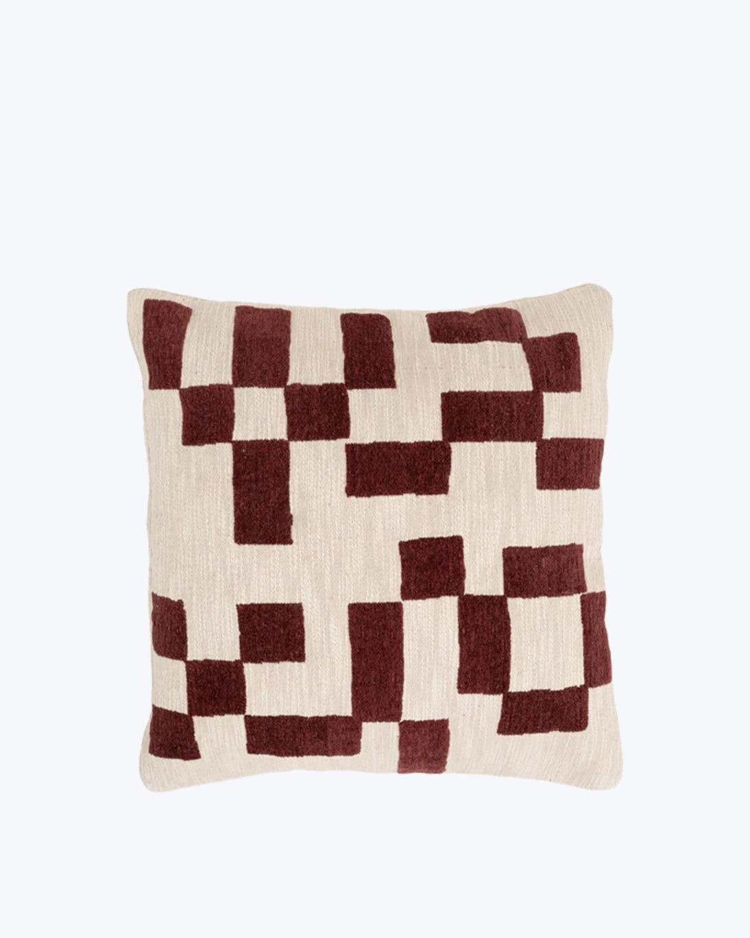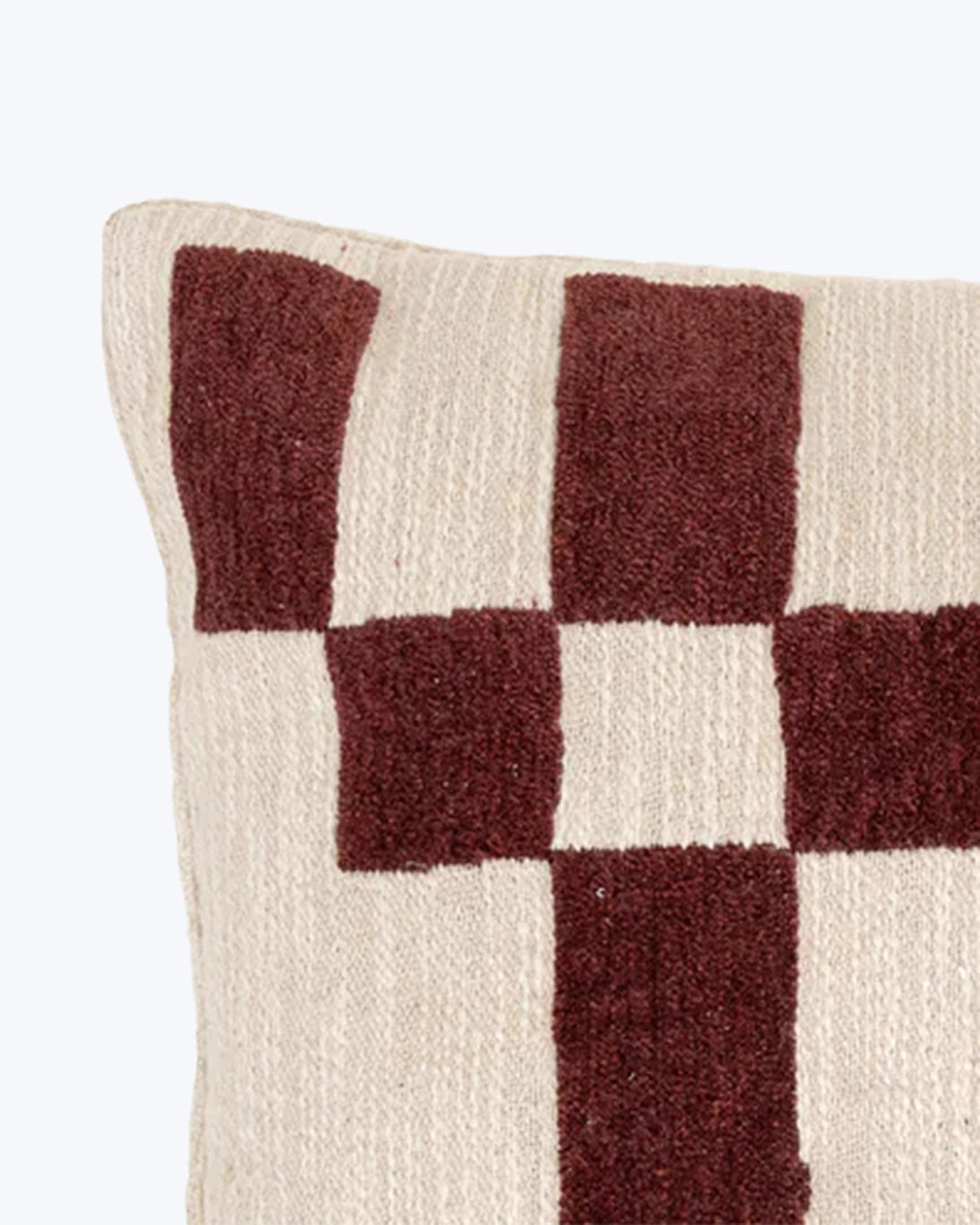 Almohadón cuadrado de color hueso con detalles en granate en la parte delantera. Por detrás es liso, en chenilla muy agradable..