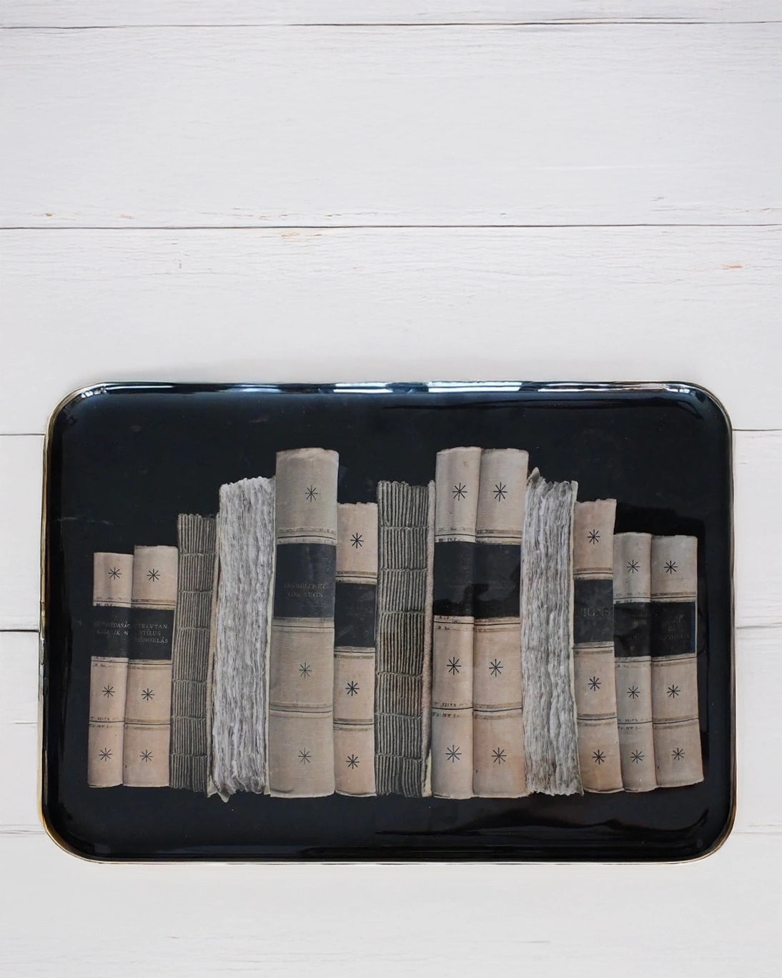 Bandeja esmaltada con fondo negro y filo dorado, con dibujo de libros dispuestos como en una librería.
