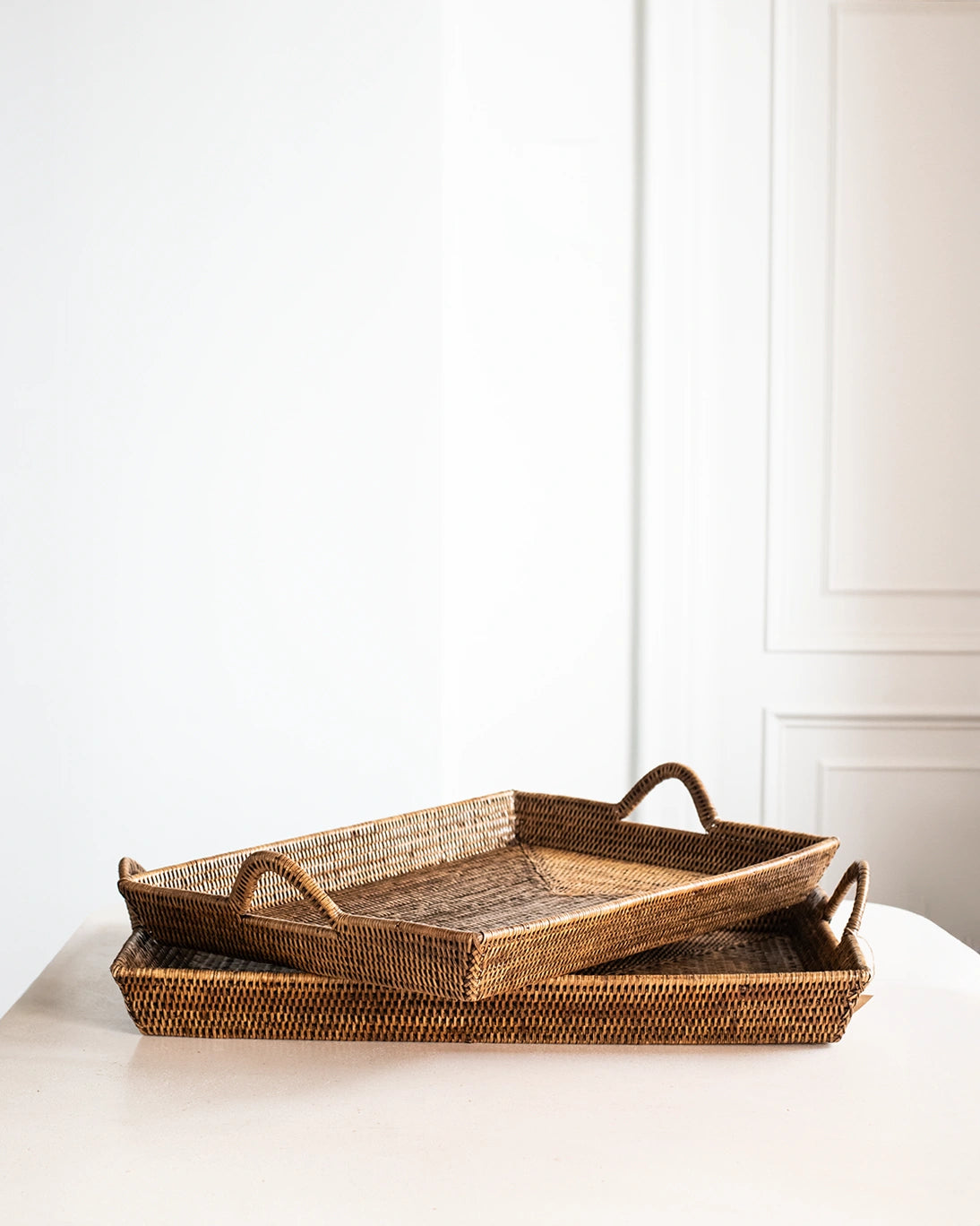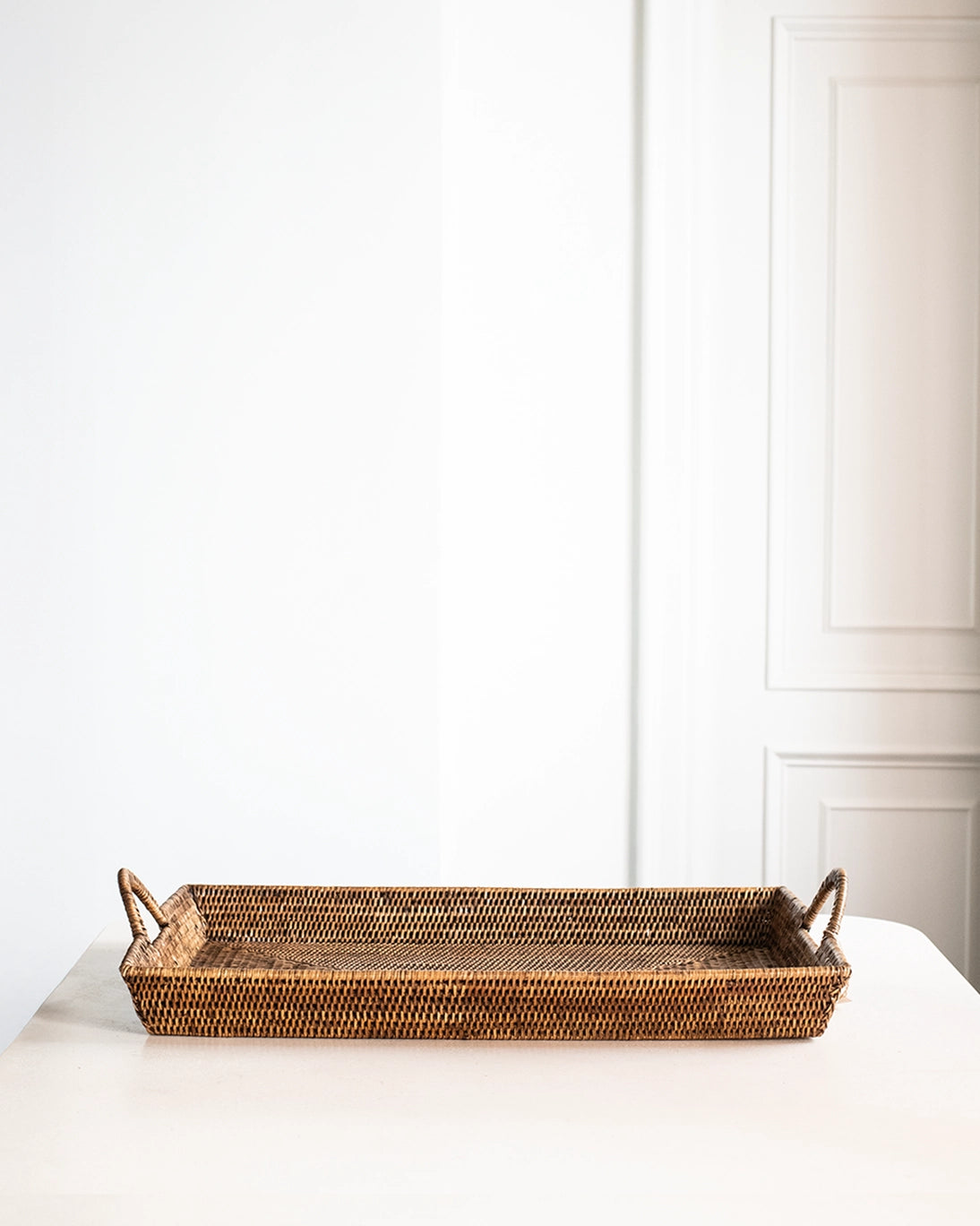 Bandeja con asas de ratán 70x47x9 cm de la marca Ishela. Aporta calidez y elegancia natural a tus espacios, elaborada en ratán de alta calidad. Con un diseño funcional, una pieza ideal para servir, organizar o decorar.