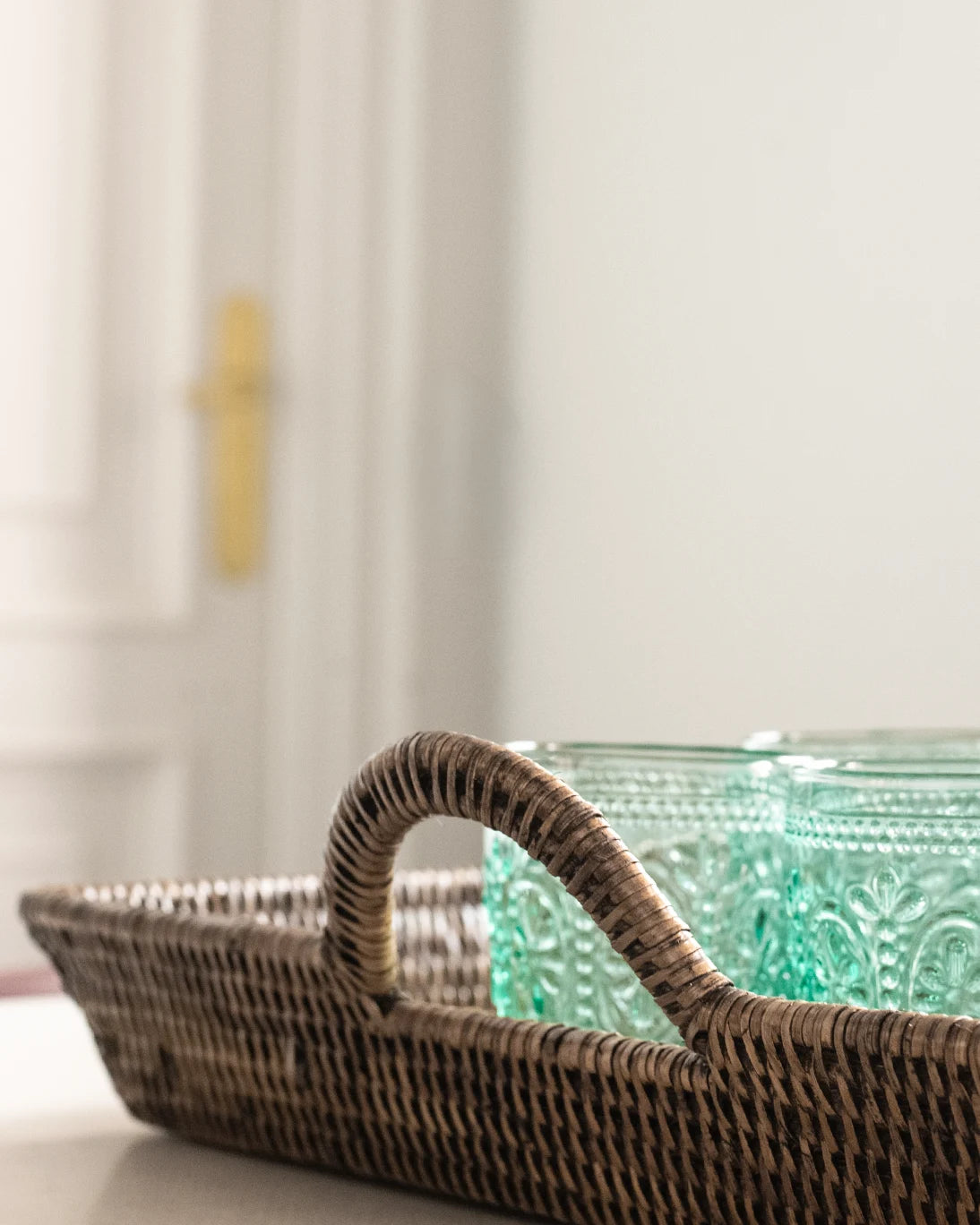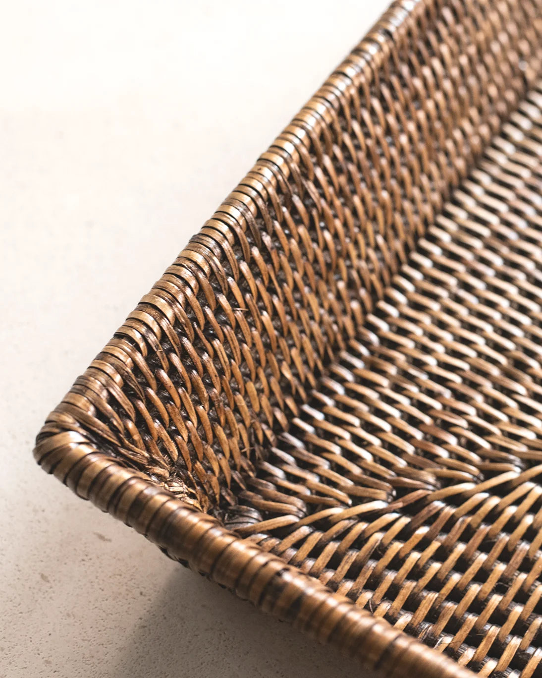 Las asas integradas en el mismo material facilitan su transporte, mientras que su trenzado artesanal resalta la textura orgánica y el encanto atemporal del ratán.