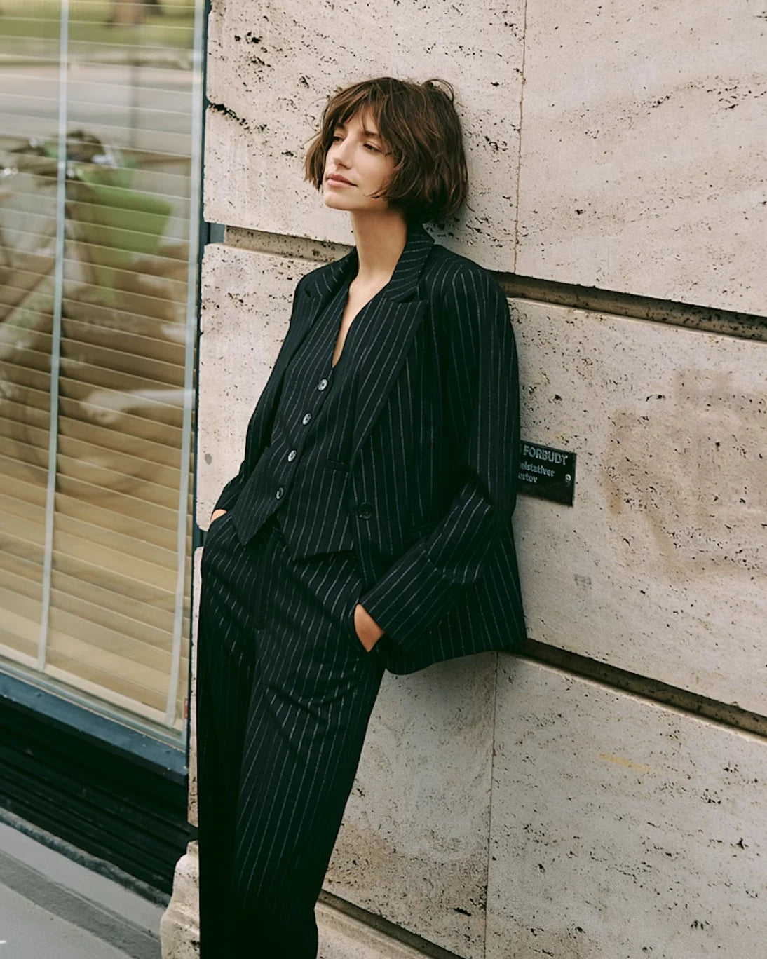Blazer Ursa de la marca Part Two. Es de color negra de rayas diplomáticas, tiene una silueta clásica con cierre de un solo botón. Su diseño atemporal y sus solapas definidas lo convierten en una prenda ideal tanto para el entorno de oficina como para ocasiones más formales.