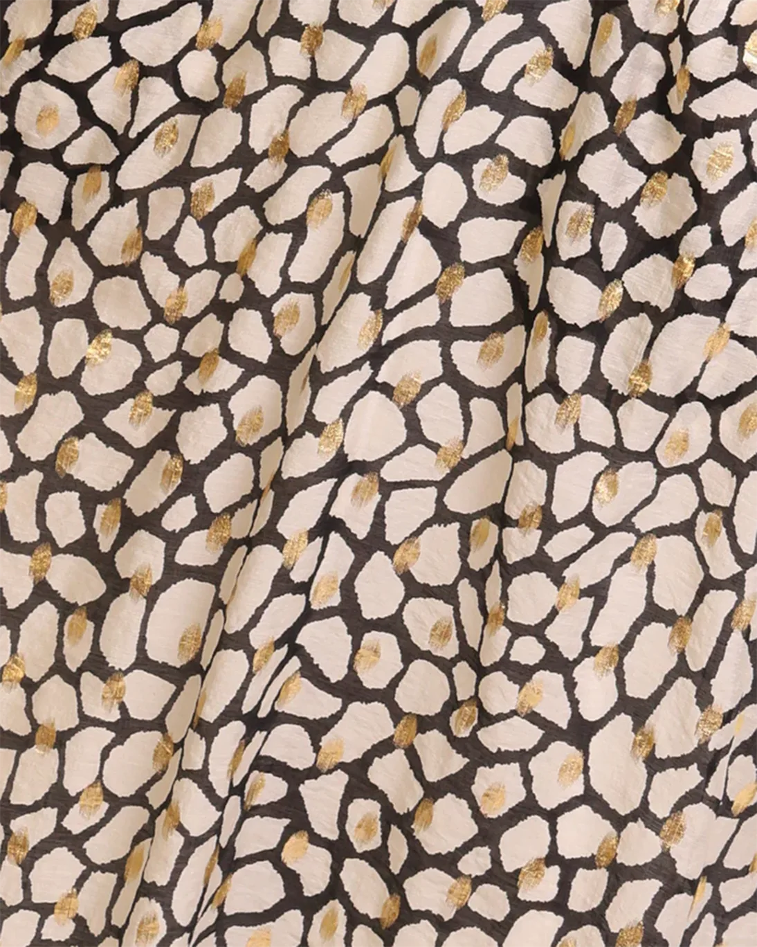Bonnie blouse from Traffic People . It 's a perfect piece for this fall/winter season. The collar is mandarin collar with a detachable bow that you can tie however you like. It has flattering puff sleeves with elastic cuffs. The print is black and white with gold polka dots .