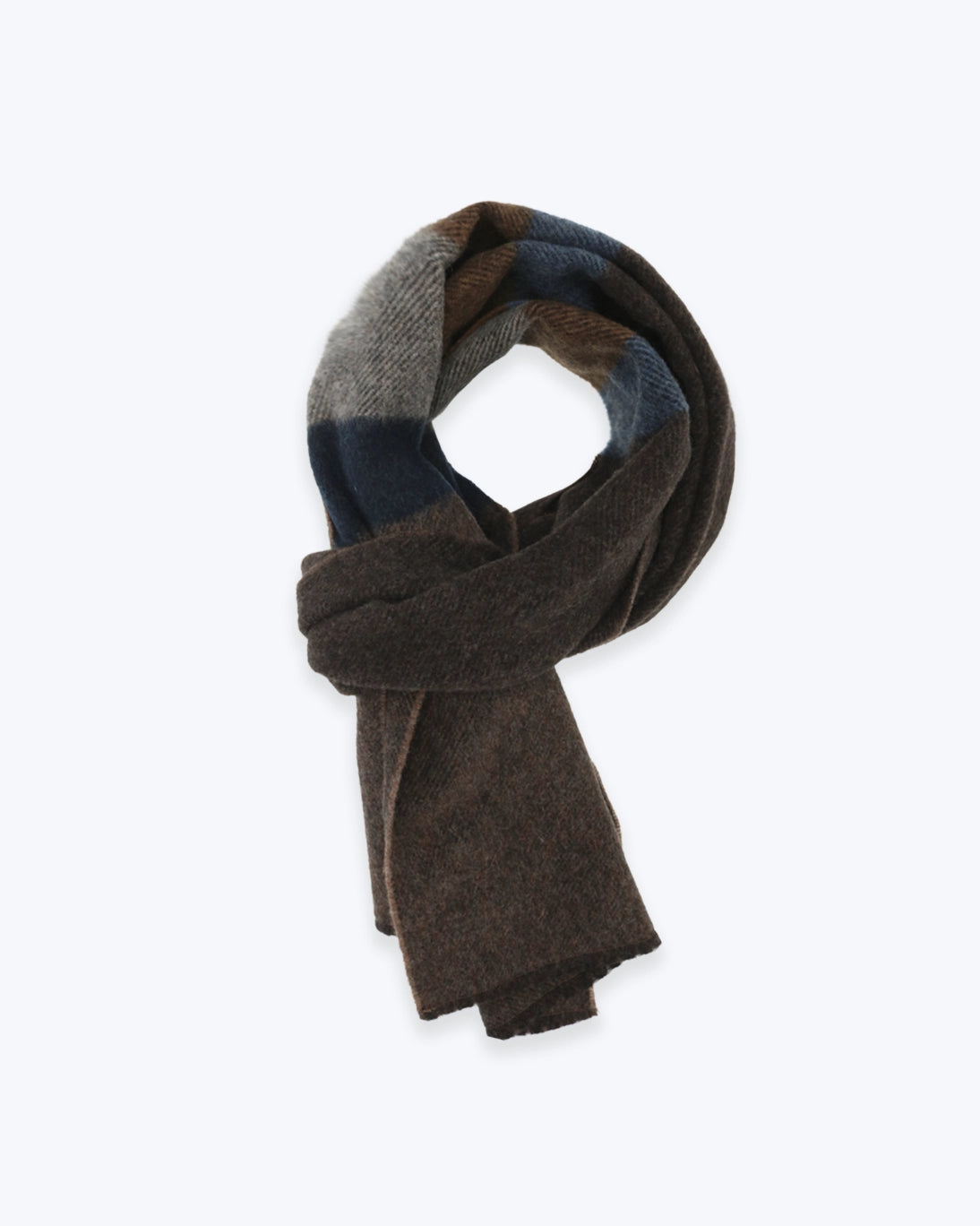 Bufanda de lana de color marrón, con rayas en los extremos en tonos marrones, gris y azul.