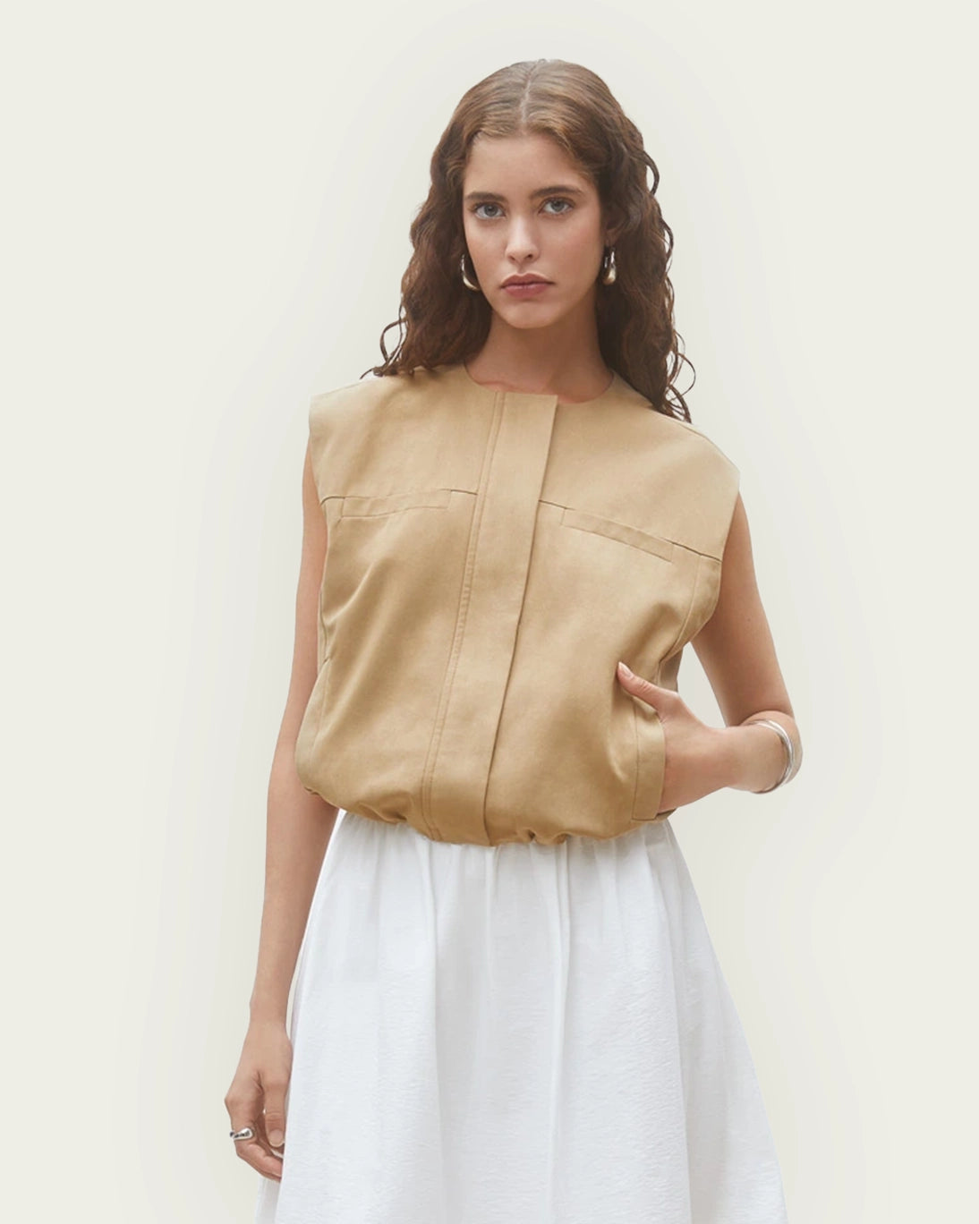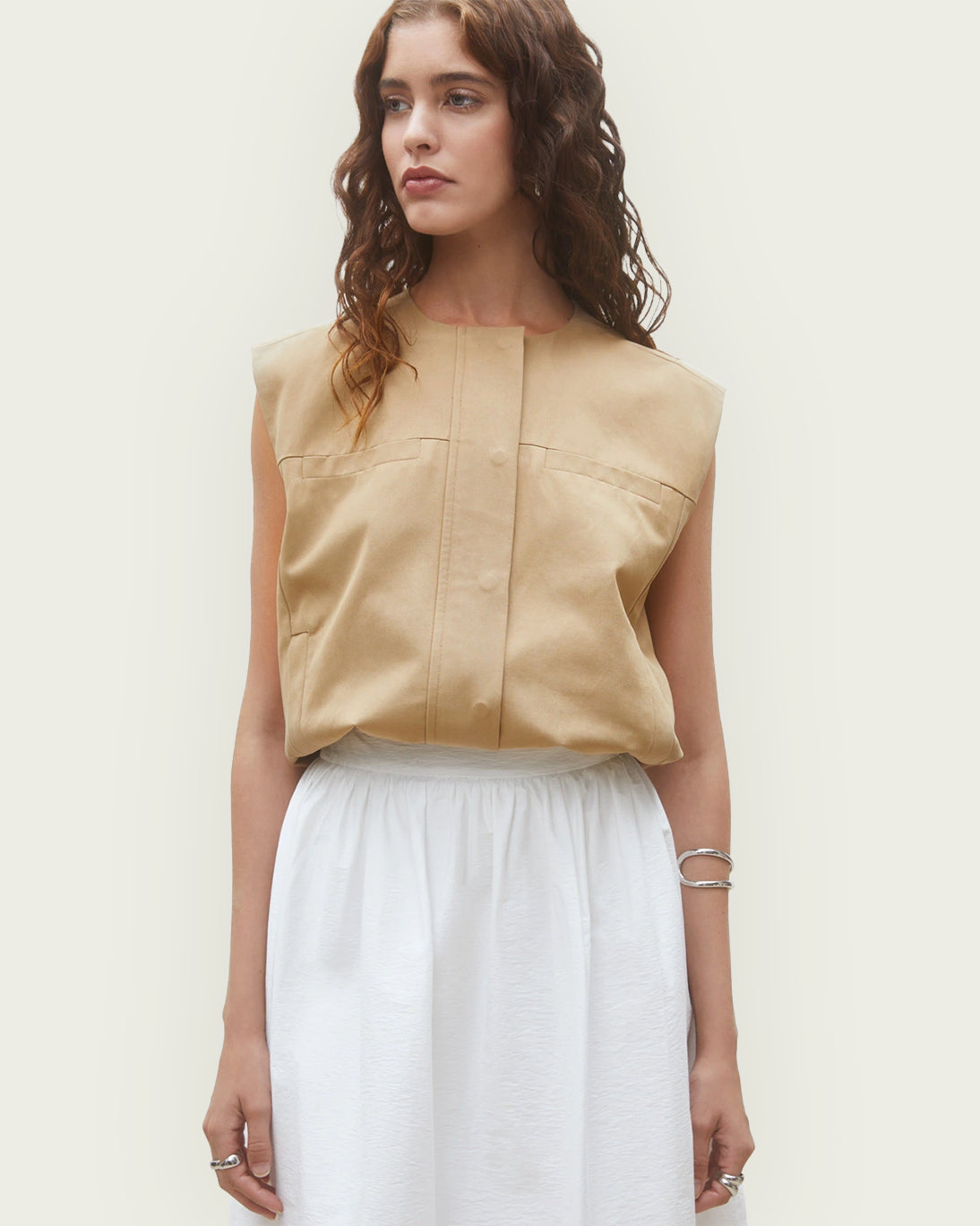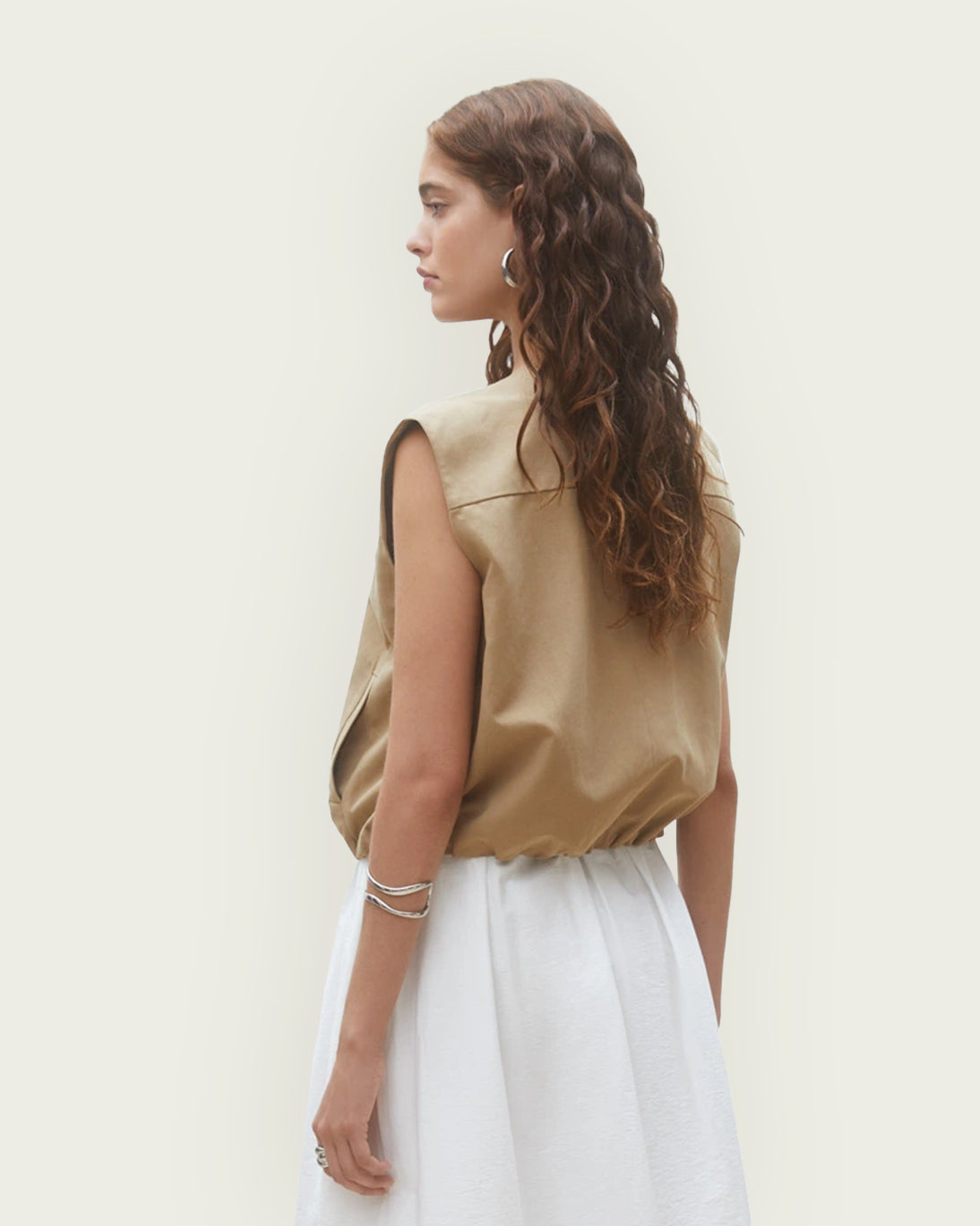 The Dan vest from Suncoo is a short , sleeveless vest, perfect for layering and adding structure to any look. It features a concealed snap button closure for a clean, minimalist aesthetic.