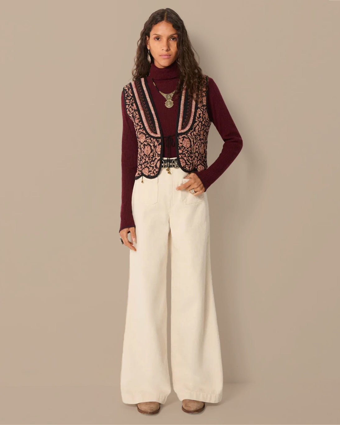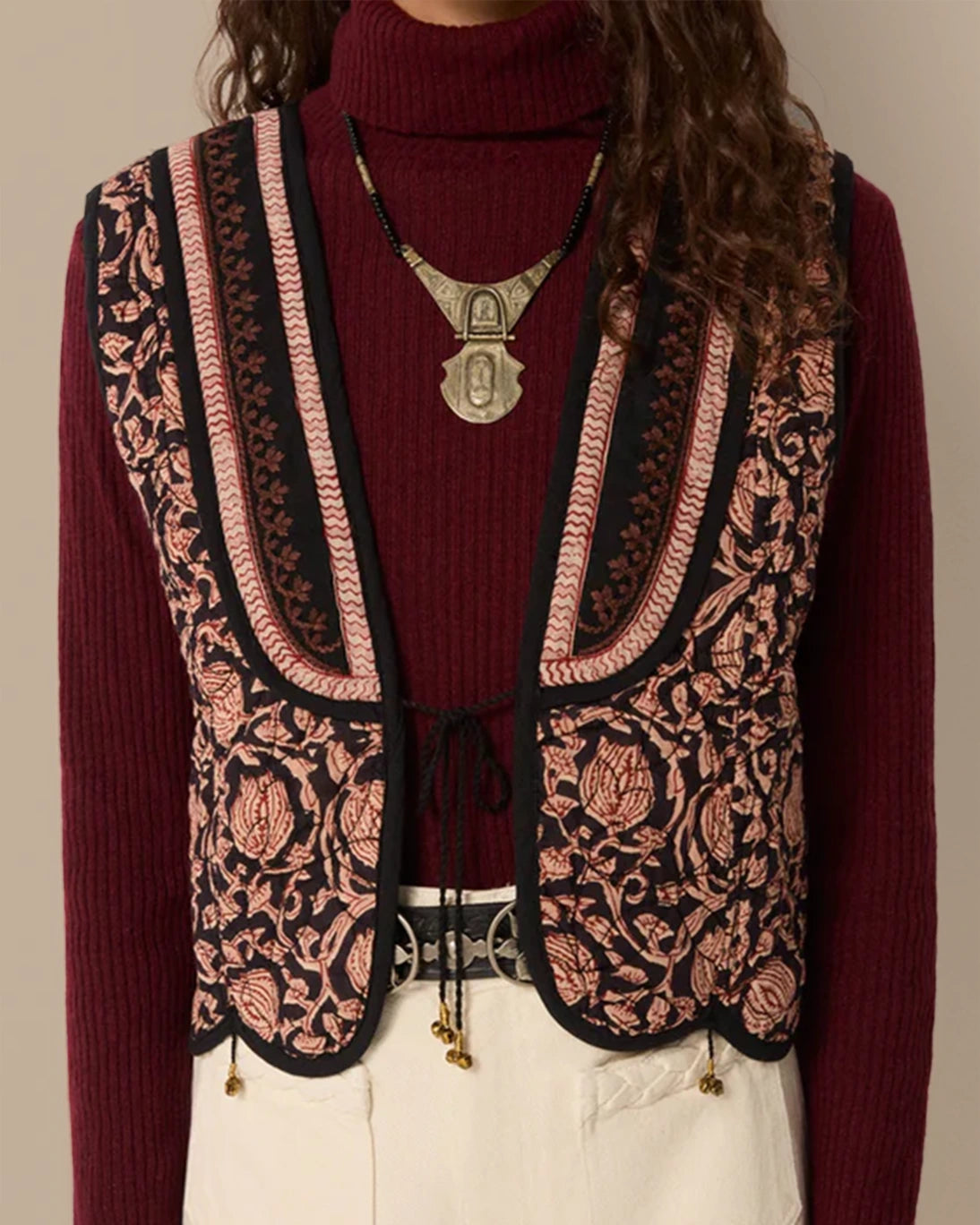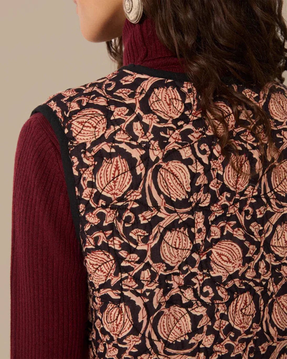 Chaleco abierto, modelo Luna, de Maison Hotel en voile de algodón estampado en un atela de inspiración india en tonos granates y rosados, con detalles bordados en la parte delantera y ribeteado en negro