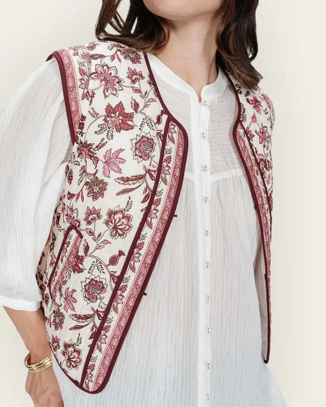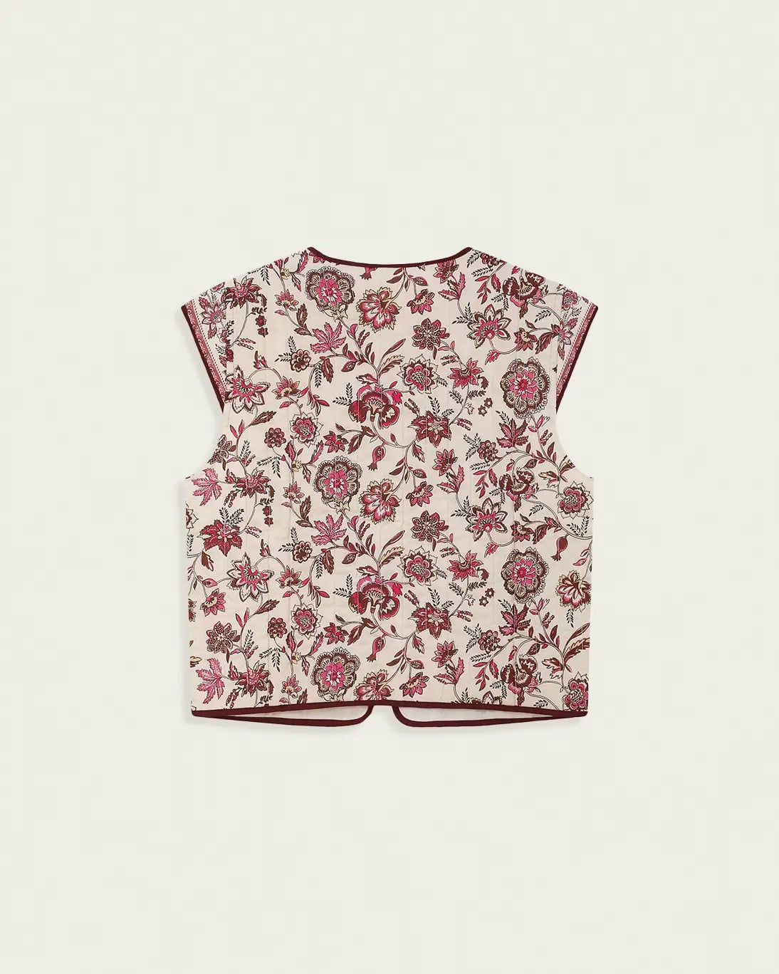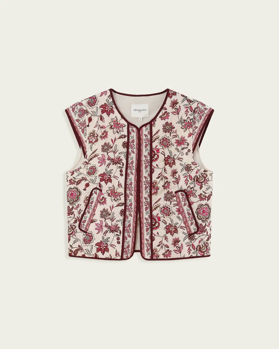 Chaleco Viola de flores de la marca Grace & Mila. Ofrece una silueta femenina y relajada. El ribete en contraste realza las costuras y aporta un acabado refinado y bien trabajado.