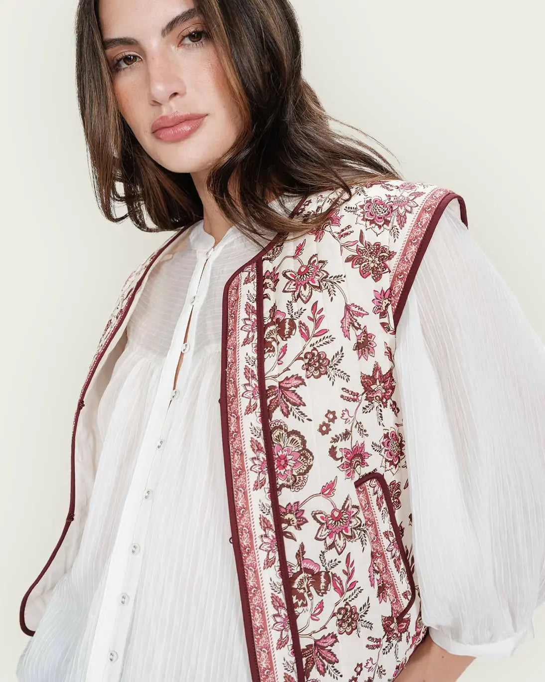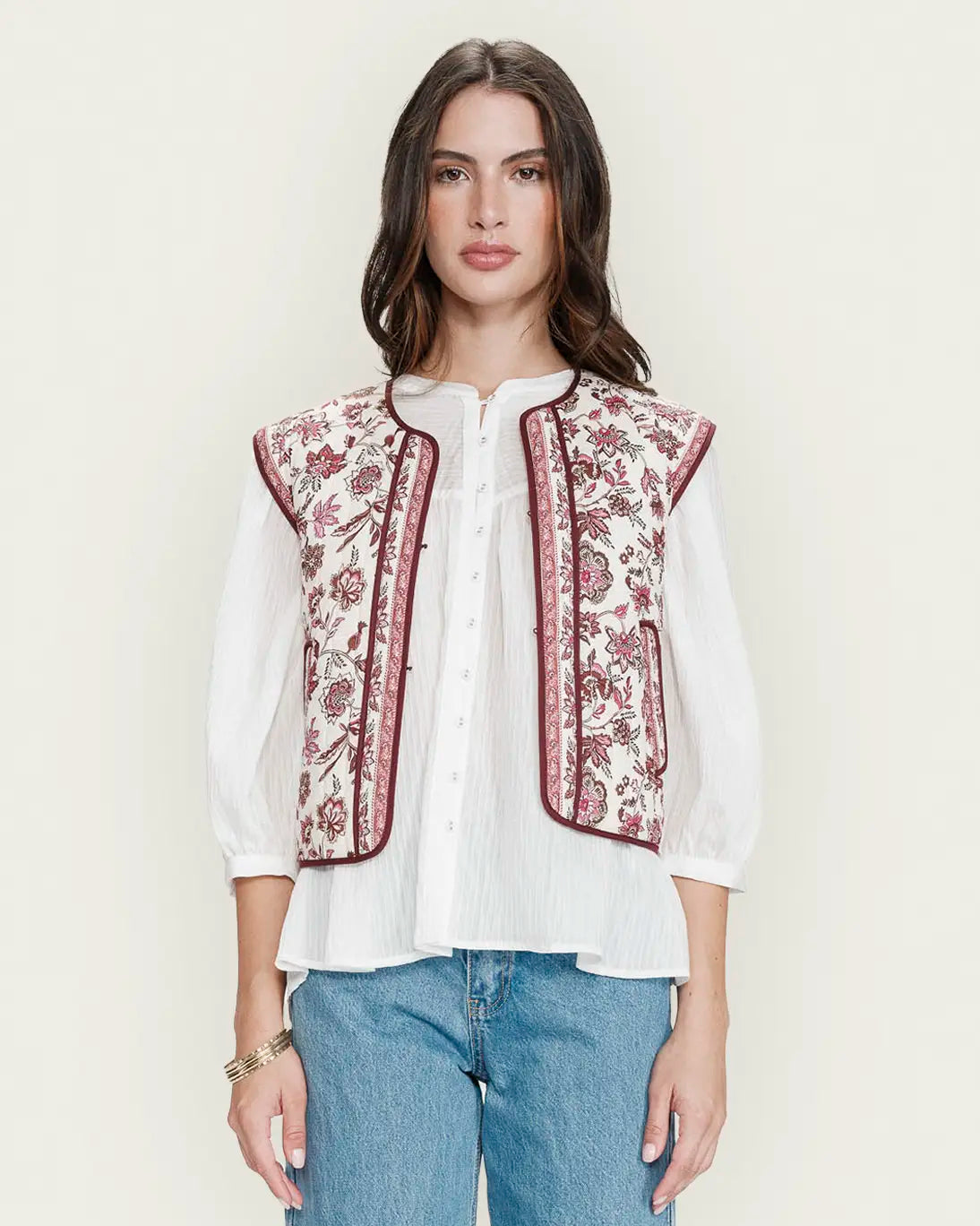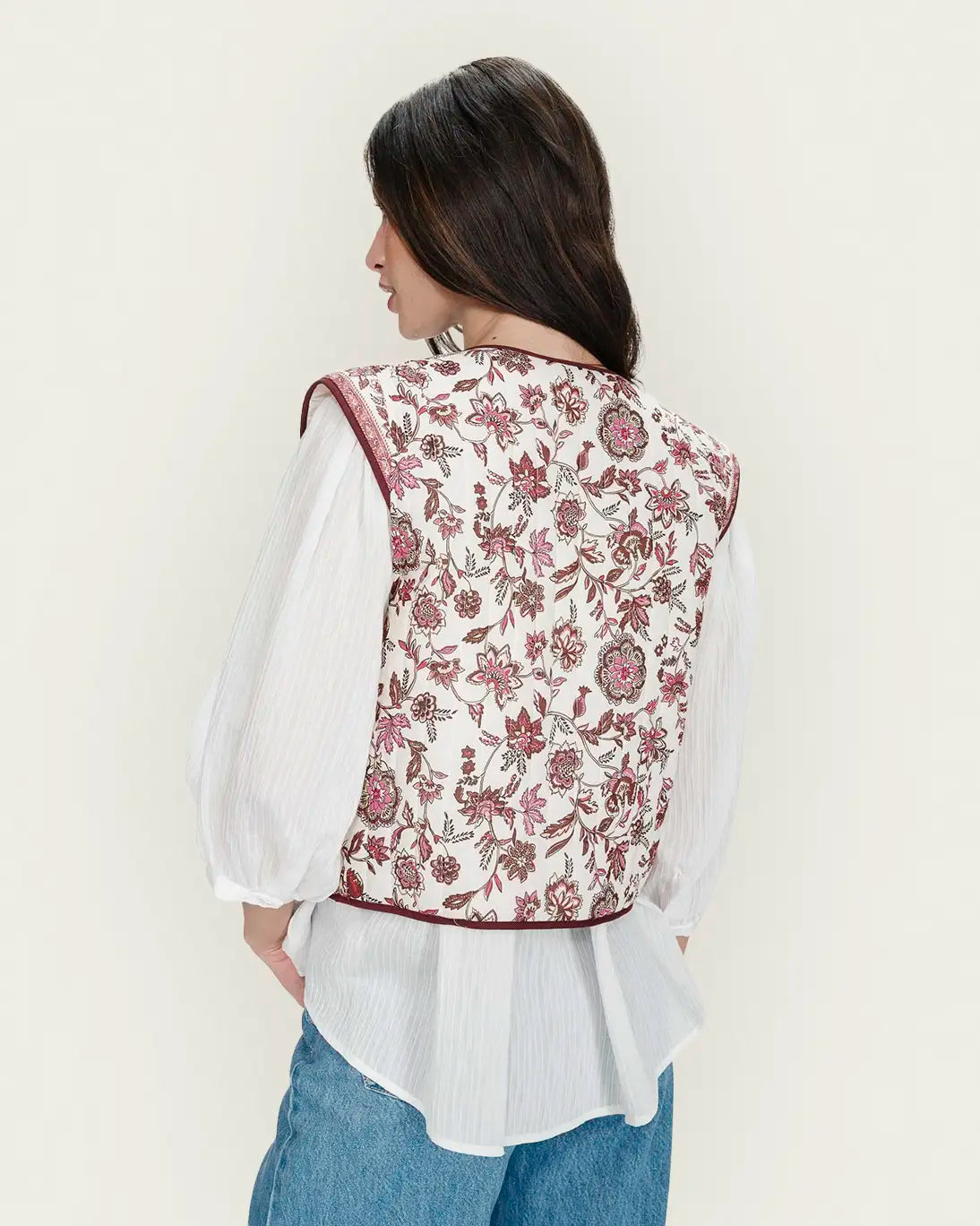 Chaleco Viola de flores de la marca Grace & Mila. Ofrece una silueta femenina y relajada. El ribete en contraste realza las costuras y aporta un acabado refinado y bien trabajado.