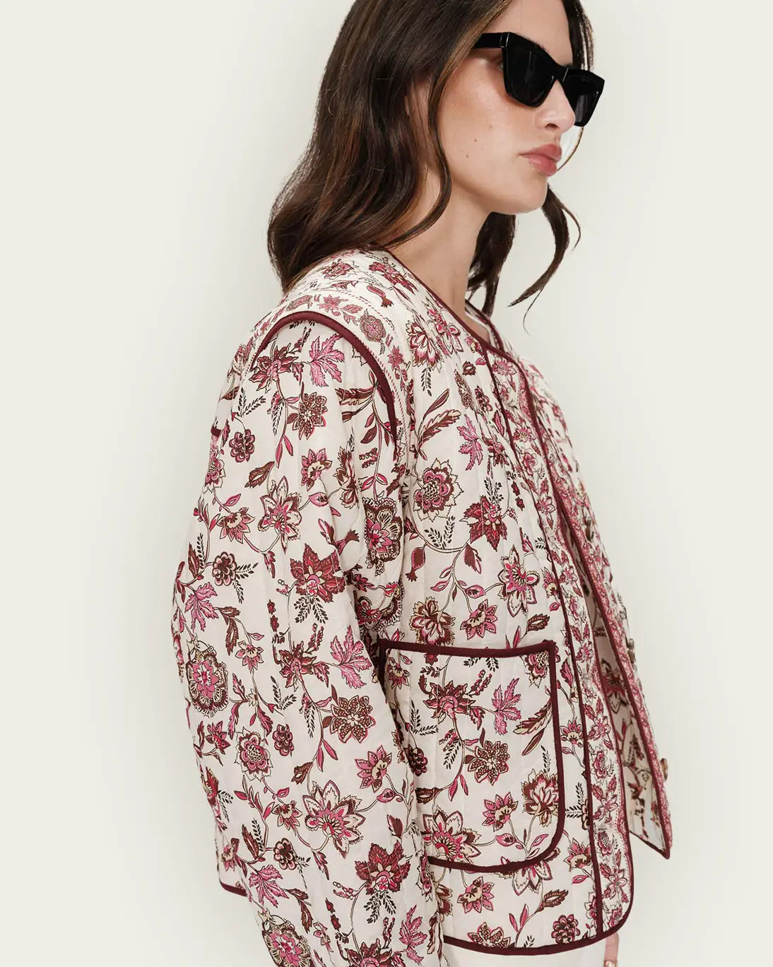 Grace & Mila 's Vahina jacket. Made from a floral quilted fabric . The contrasting piping detail highlights the seams and provides a refined, well-crafted finish.