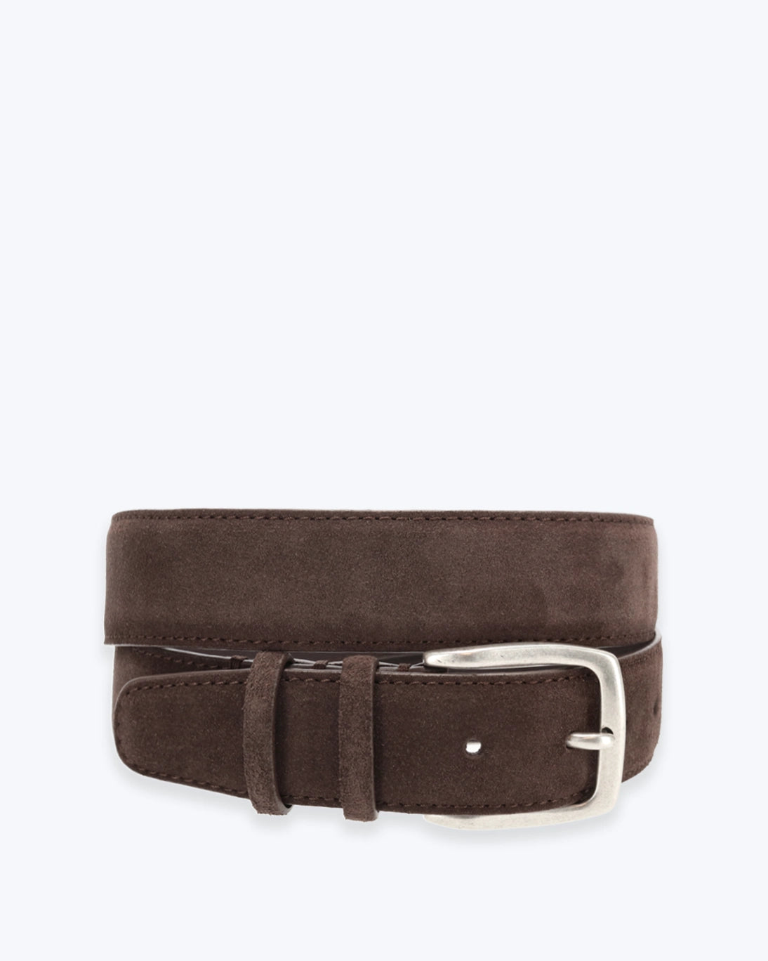Cinturón liso de ante marrón oscuro con hebilla metálica color plata vieja.