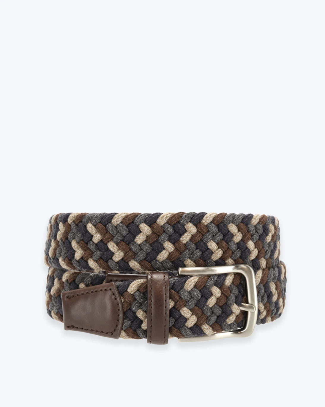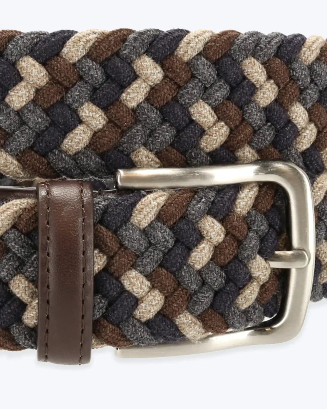 Cinturón elástico trenzado de algodón, en colores combinados en azules y marrones.
