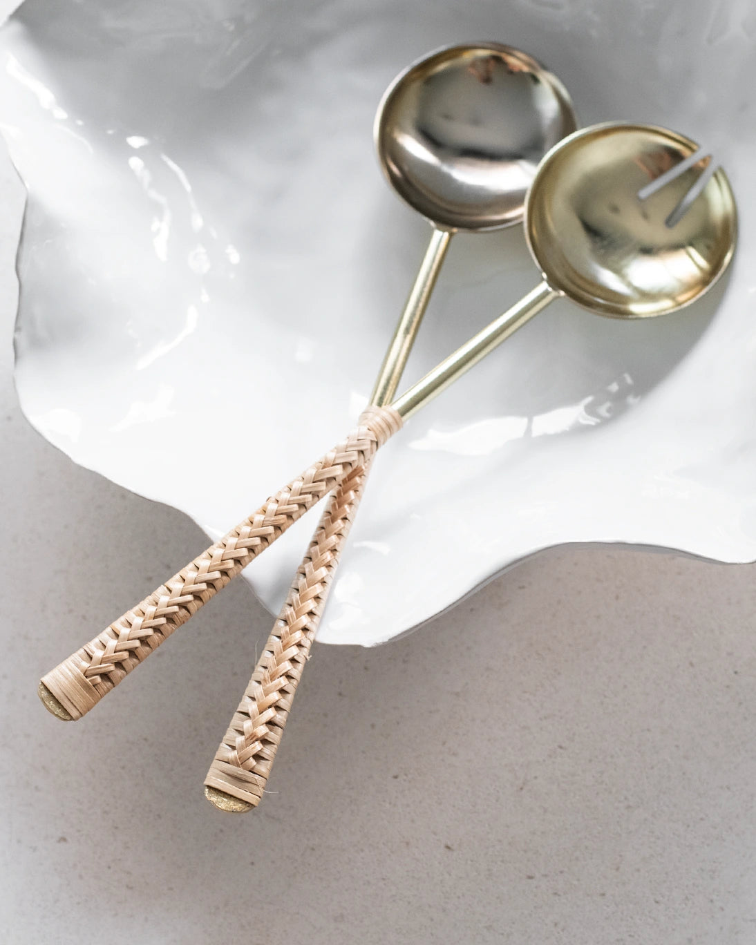 Bamboo serving cutlery from Cote Table . This serving cutlery set combines functionality and natural style . Made from high-quality stainless steel , they feature rattan -wrapped handles, adding a warm, rustic, and handcrafted touch to your table. Their ergonomic design ensures a comfortable grip, while the contrast between the polished metal and the organic texture of the rattan makes them as decorative as they are practical.