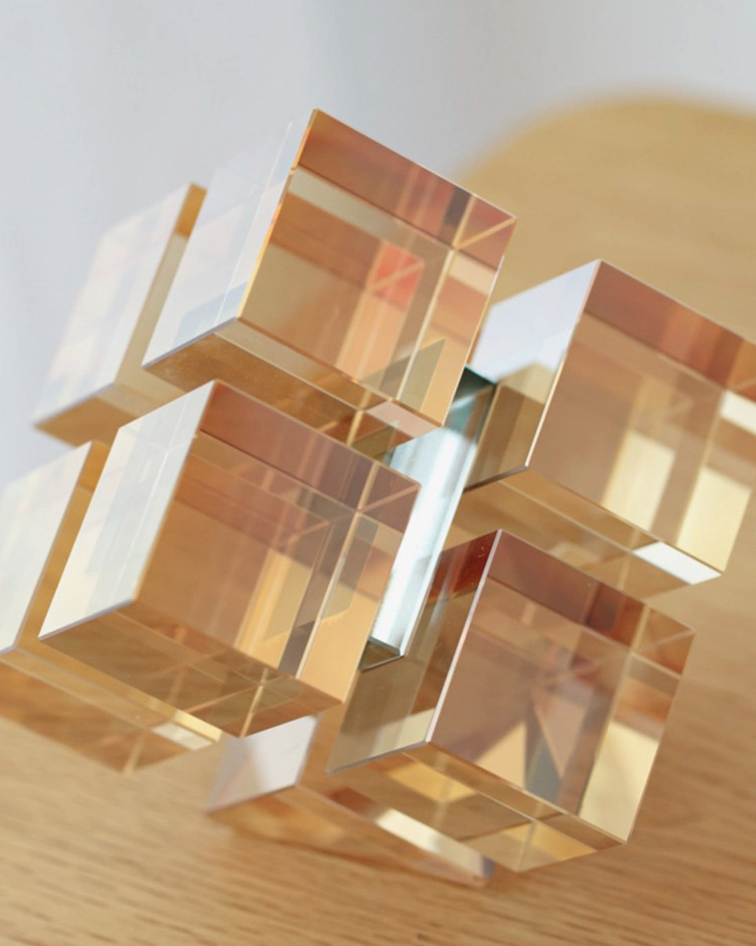 Apia glass sculpture , 9.5x9.5x9.5cm. This Apia glass sculpture, in a country color, stands out for its geometric and minimalist design. It captures light from different angles, creating soft reflections that enrich the environment.