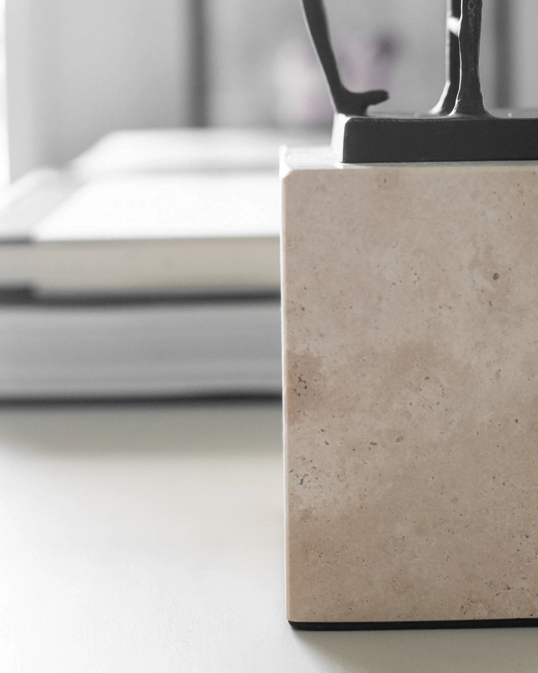 Montada sobre una base sólida de mármol, la obra combina la fuerza del material con la sutileza del diseño. Su formato vertical de 35 cm de alto la convierte en un punto focal ideal para estanterías, escritorios o mesas auxiliares.