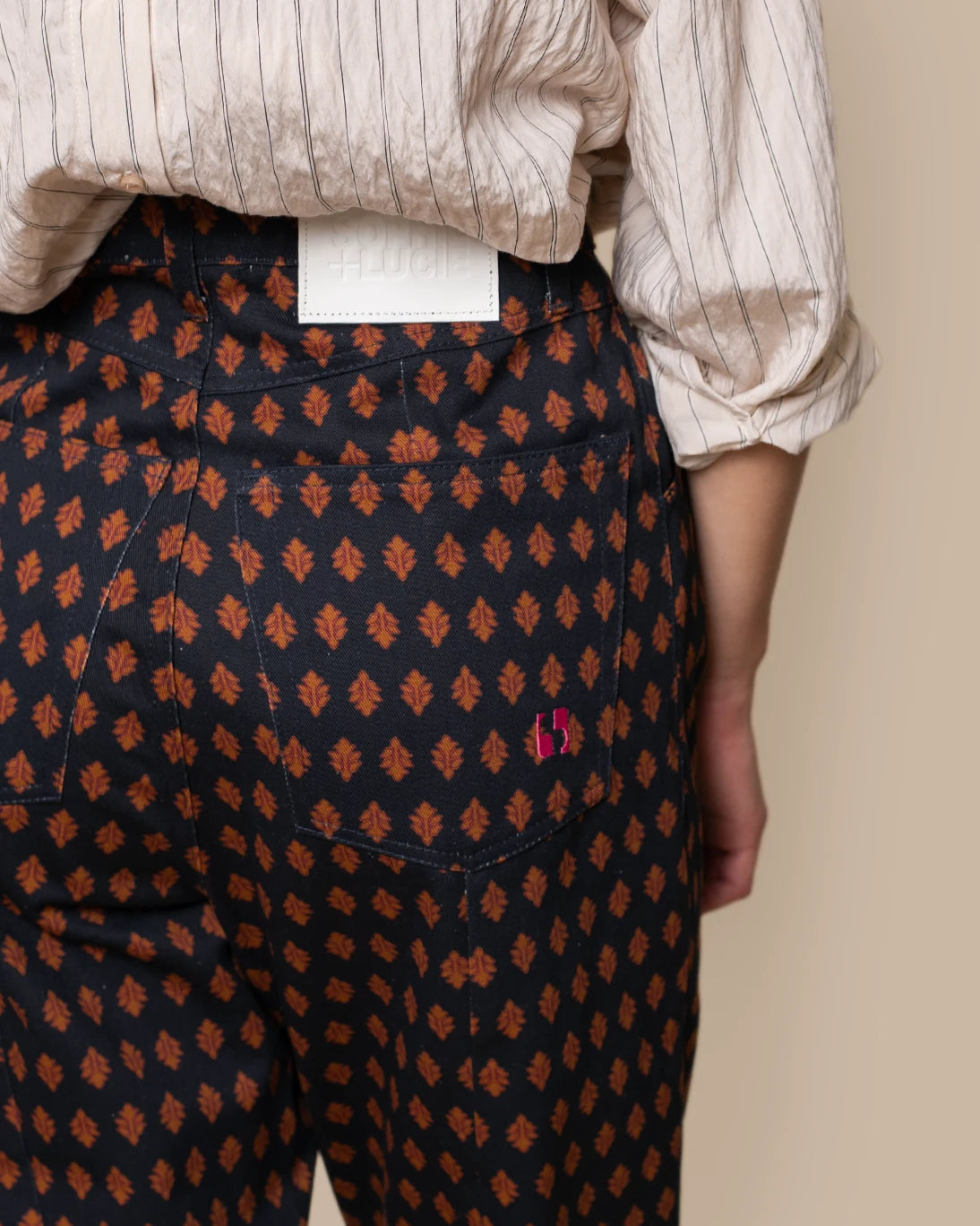 Sophie & Lucie Pineapple Corset Jeans. They have a straight cut and a mid-rise, featuring a geometric print in brown on a black background. They are ankle-length and feature five pockets, a metal button closure, and a zipper.