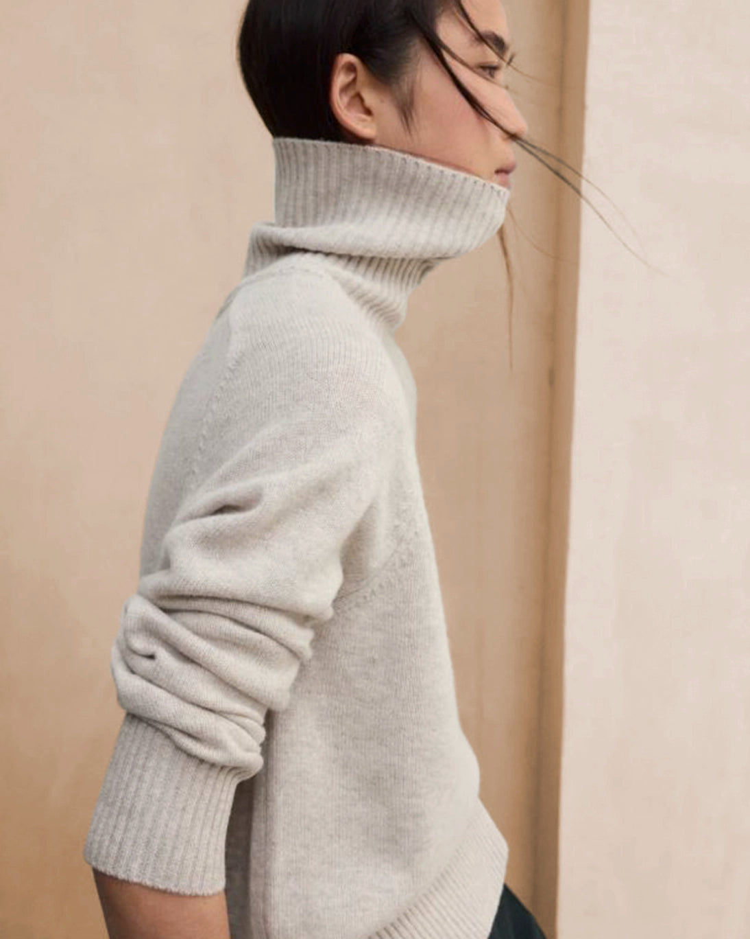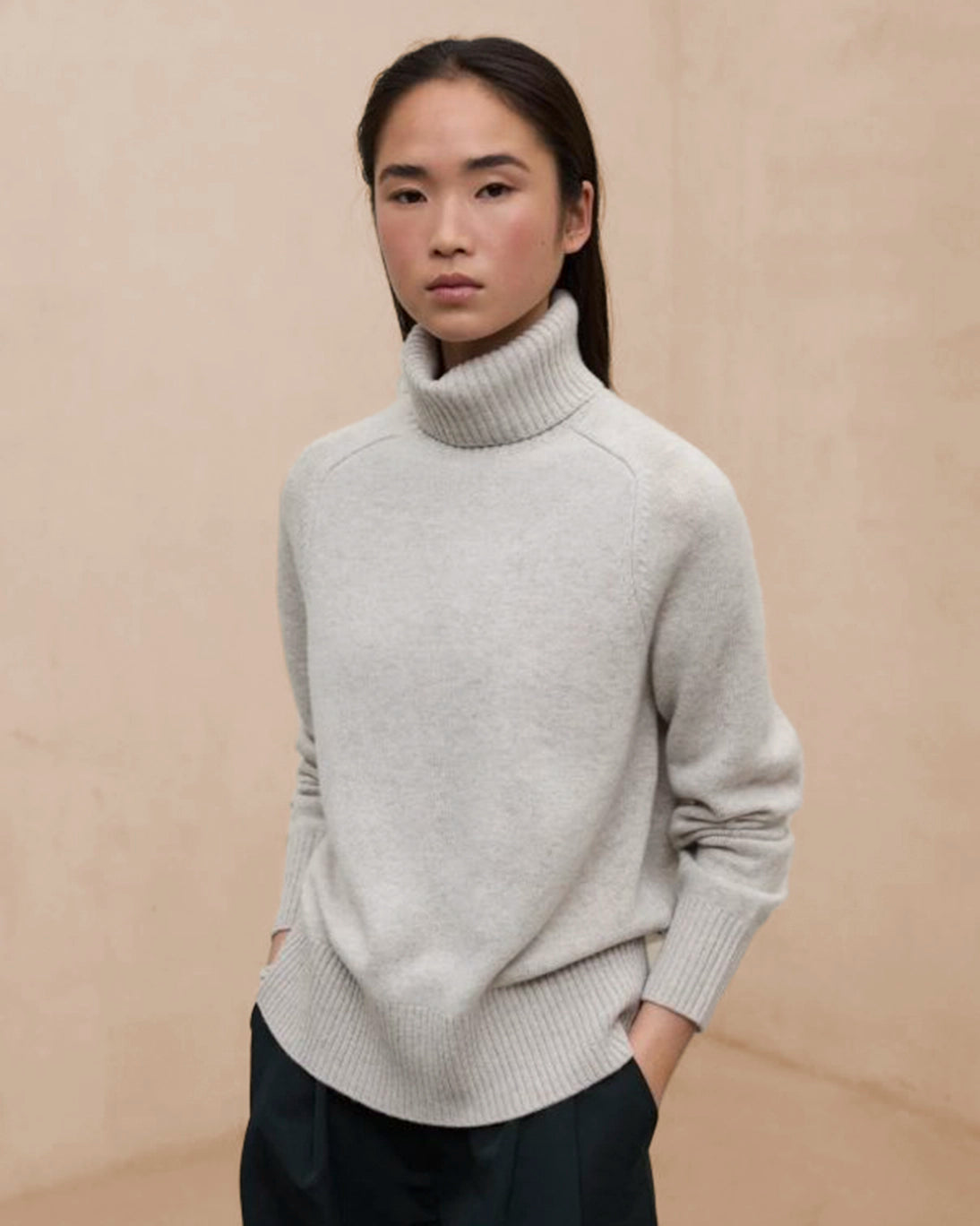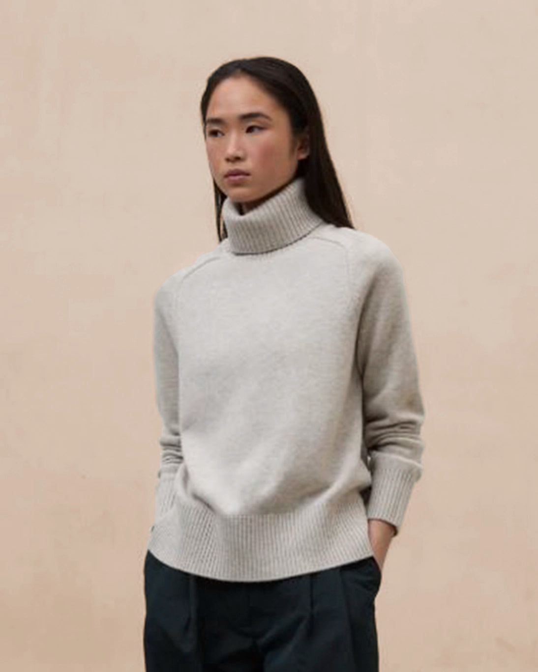 Es un jersey con cuello vuelto, grosor medio, de corte relajado y manga ranglan.
