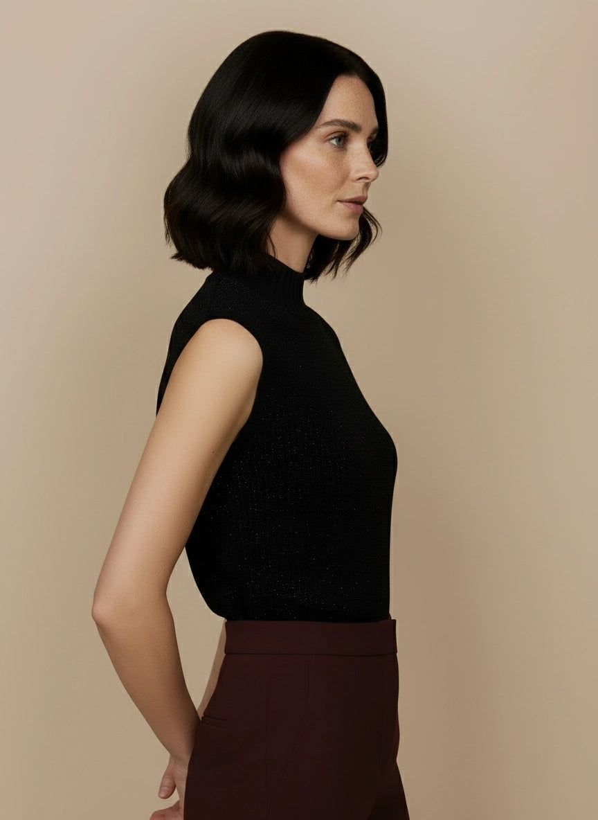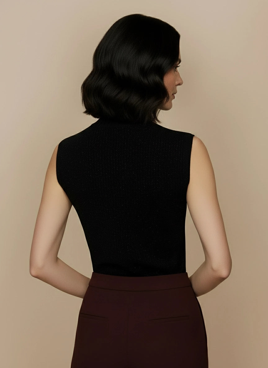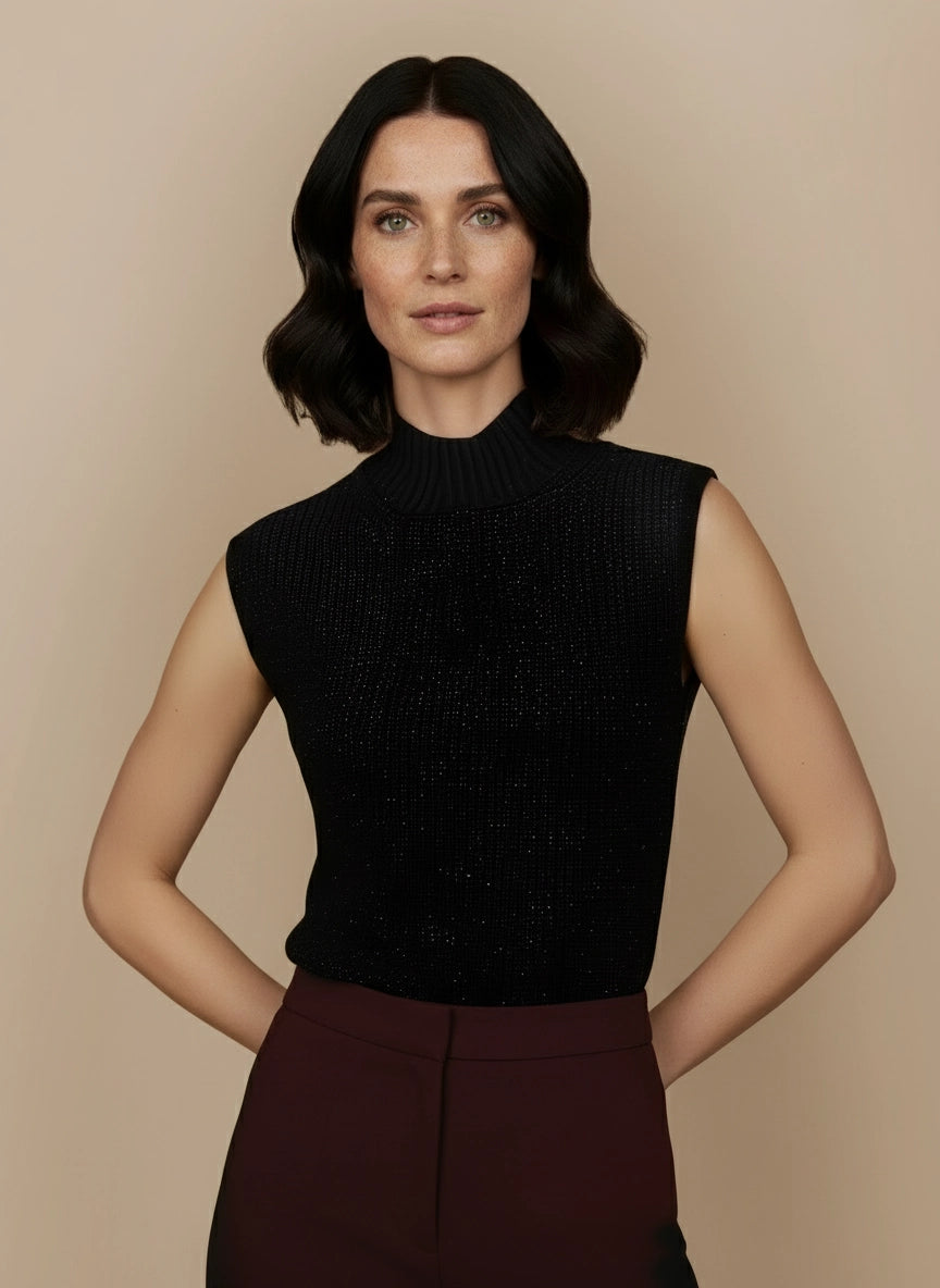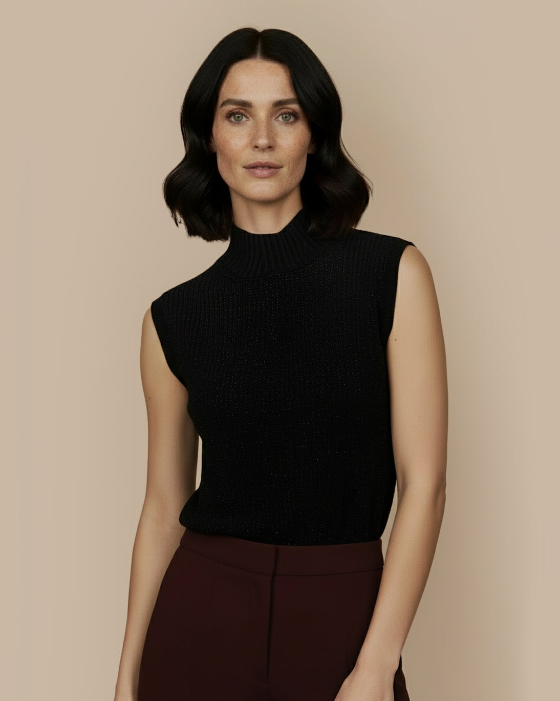 Moutaki vest. The cut is straight with slightly dropped shoulders. The fabric is black knit with small gold accents.