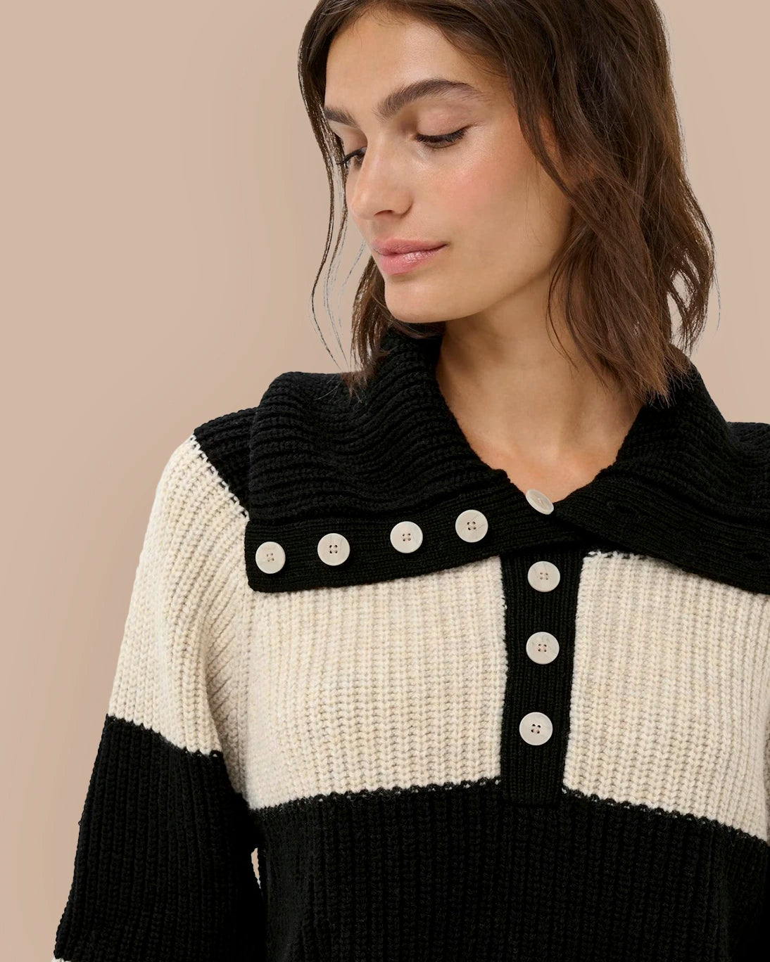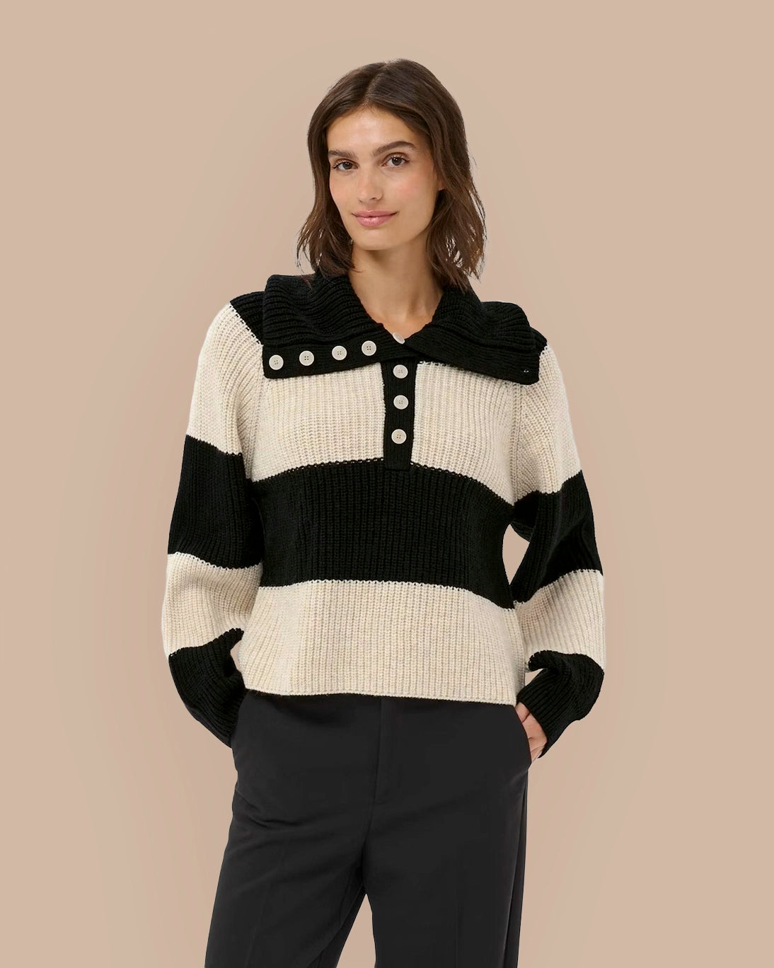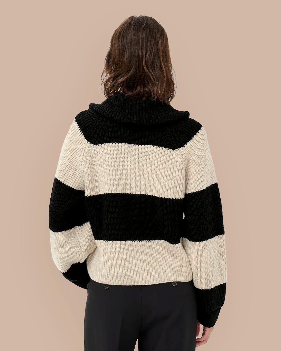 Simra sweater from Part Two. Its soft ribbed knit offers a warm and pleasant feel. Featuring wide stripes in black and beige , it stands out for its contemporary and versatile design.