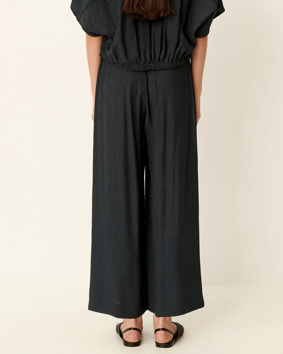 Pantalón ancho fluido en tejido de crespón, de Sessun, en color verde.