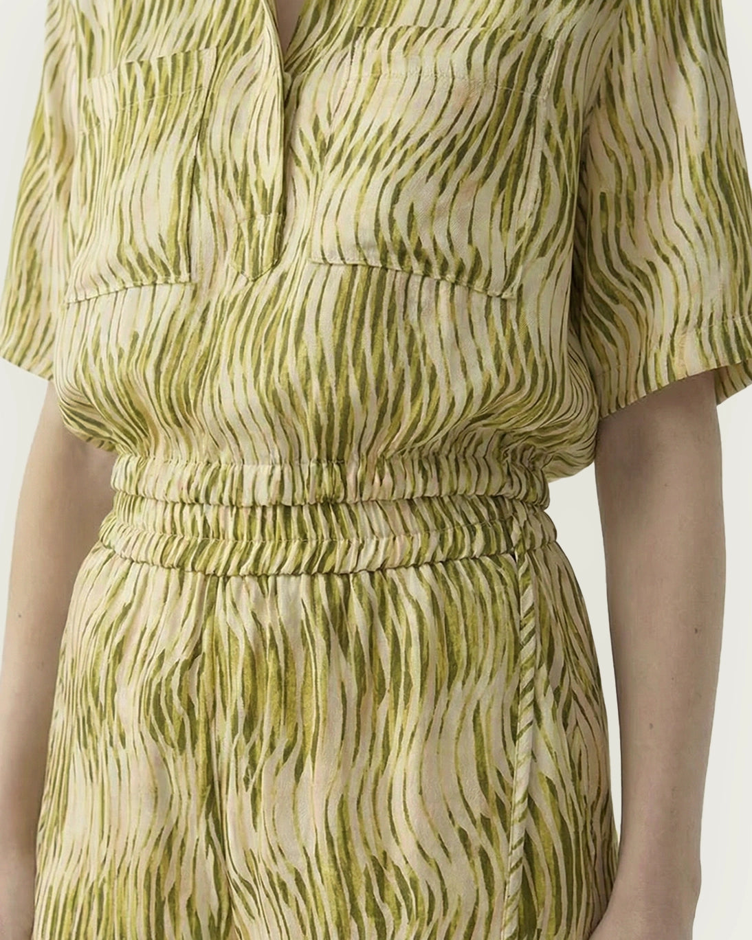 It features an elasticated waistband that comfortably adapts to the silhouette , as well as an adjustable belt for added comfort and versatility. Its green and white design perfectly complements the matching shirt, creating a modern and flattering coordinated look.