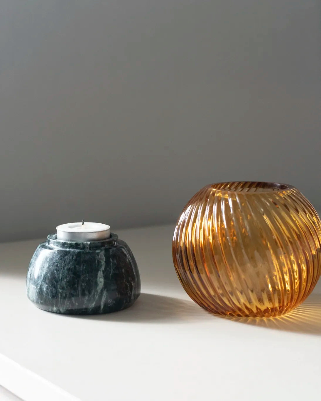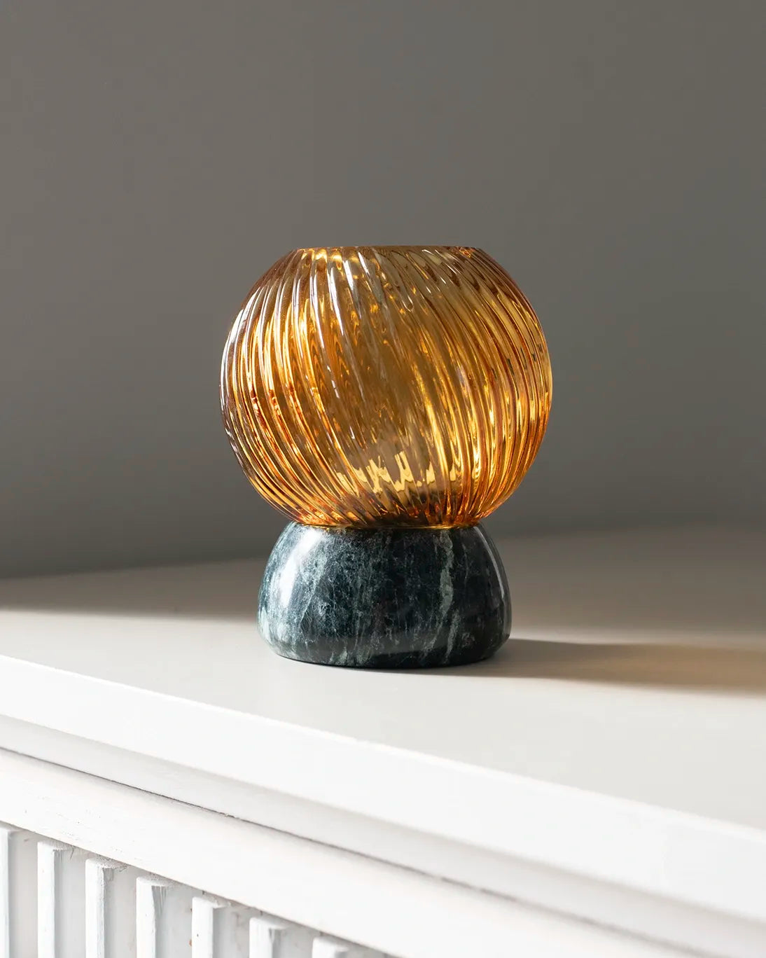 La luz de la vela se filtra a través del vidrio acanalado color caramelo, proyectando un resplandor cálido y envolvente que realza la profundidad del mármol y crea una atmósfera íntima.