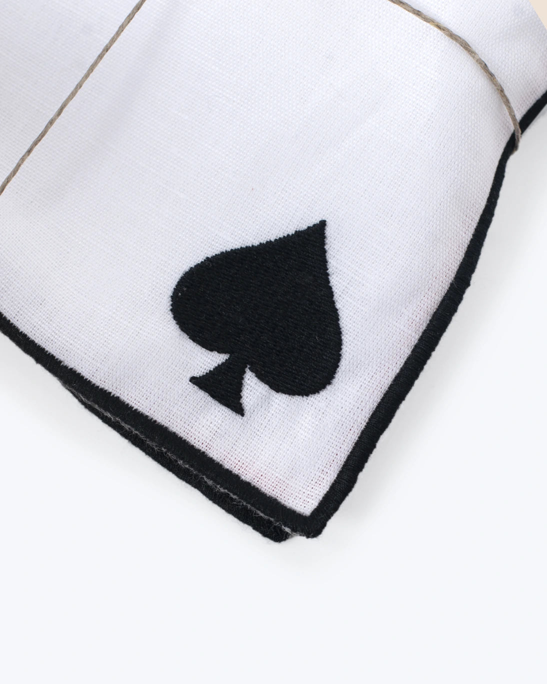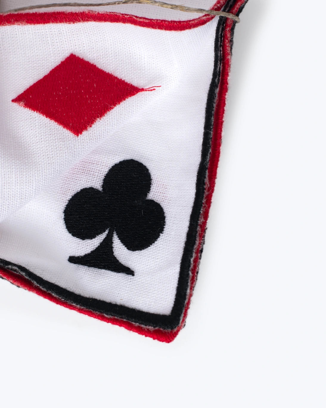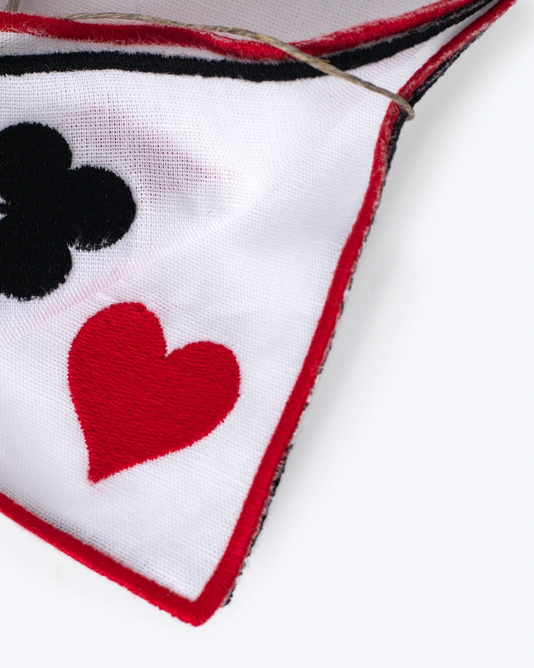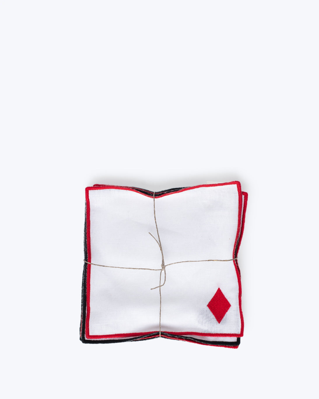 Set de 4 servilletas de algodón y lino para aperitivo, de color blanco con ribete rojo o negro, y un bordado de cada uno de los palos de la baraja francesa en cada servilleta.