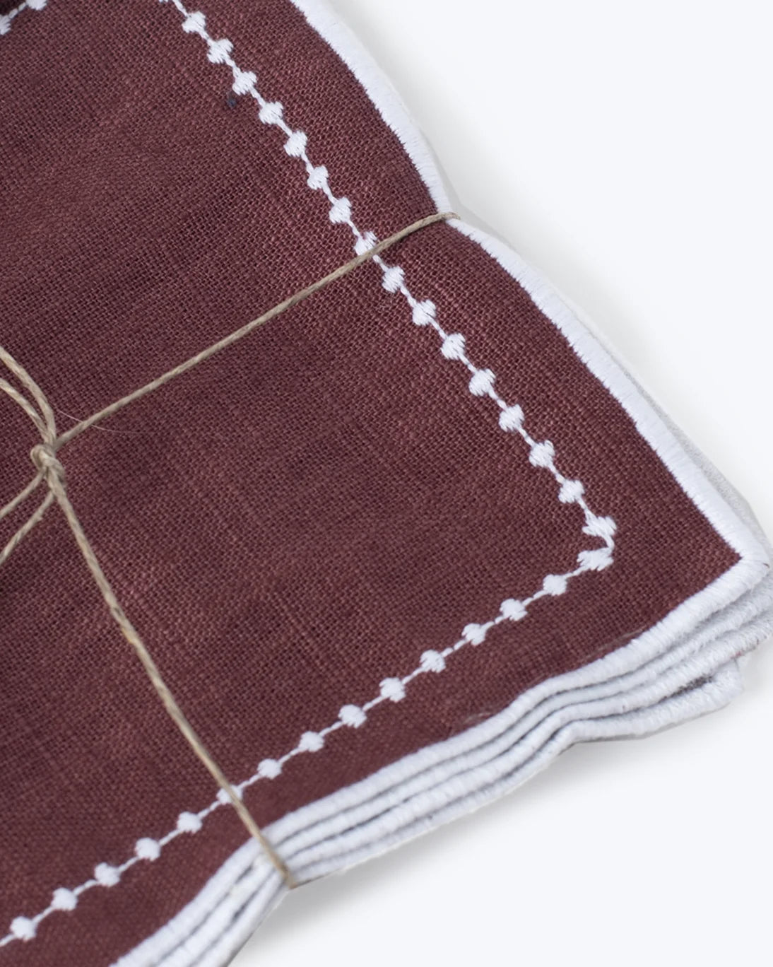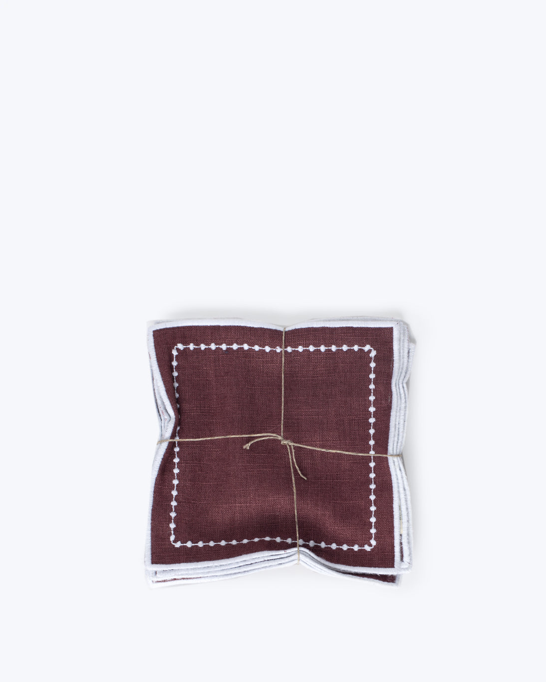 Set de 6 servilletas de lino para aperitivo, de color burdeos con ribete y greca de pequeños bodoques en blanco.