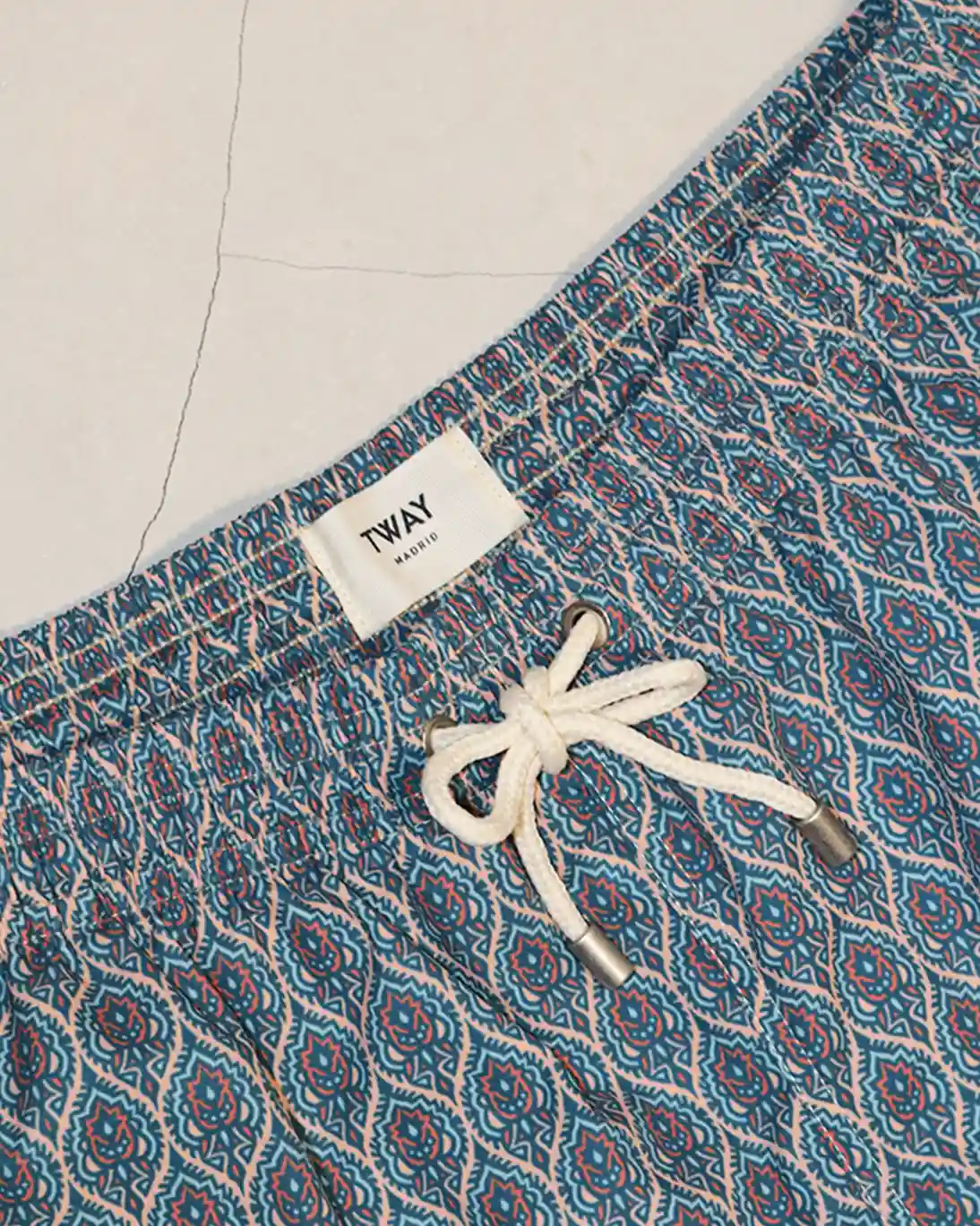 Traje de baño de hombre en azul oscuro con un estampado que recuerda a los tradicionales tejidos indios, de nuestra marca preferida de moda de hombre, Tway.