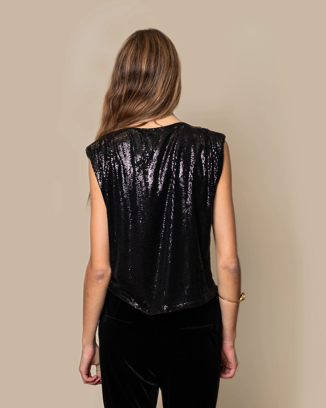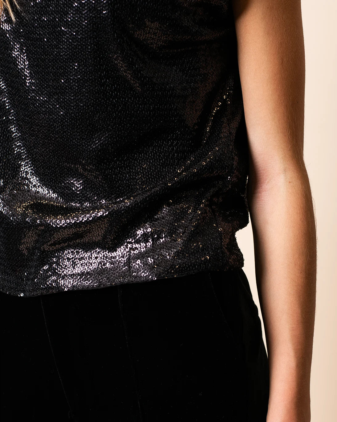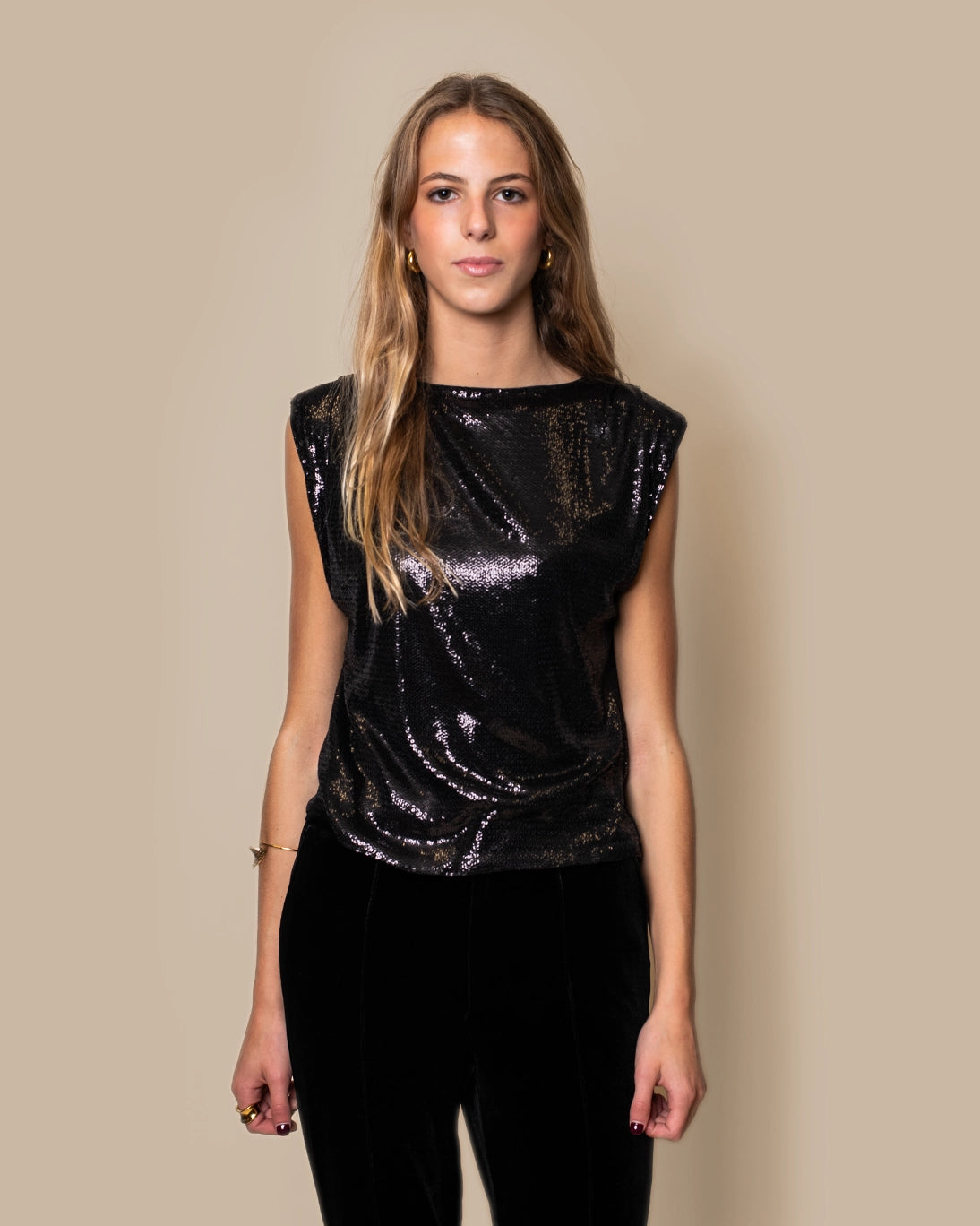 The Louise top from Suncoo is an elegant and versatile piece that elevates any outfit. Designed in black and adorned with sequins , this sleeveless blouse features a boat neckline and subtle ruching at the shoulders , adding a feminine and modern touch.