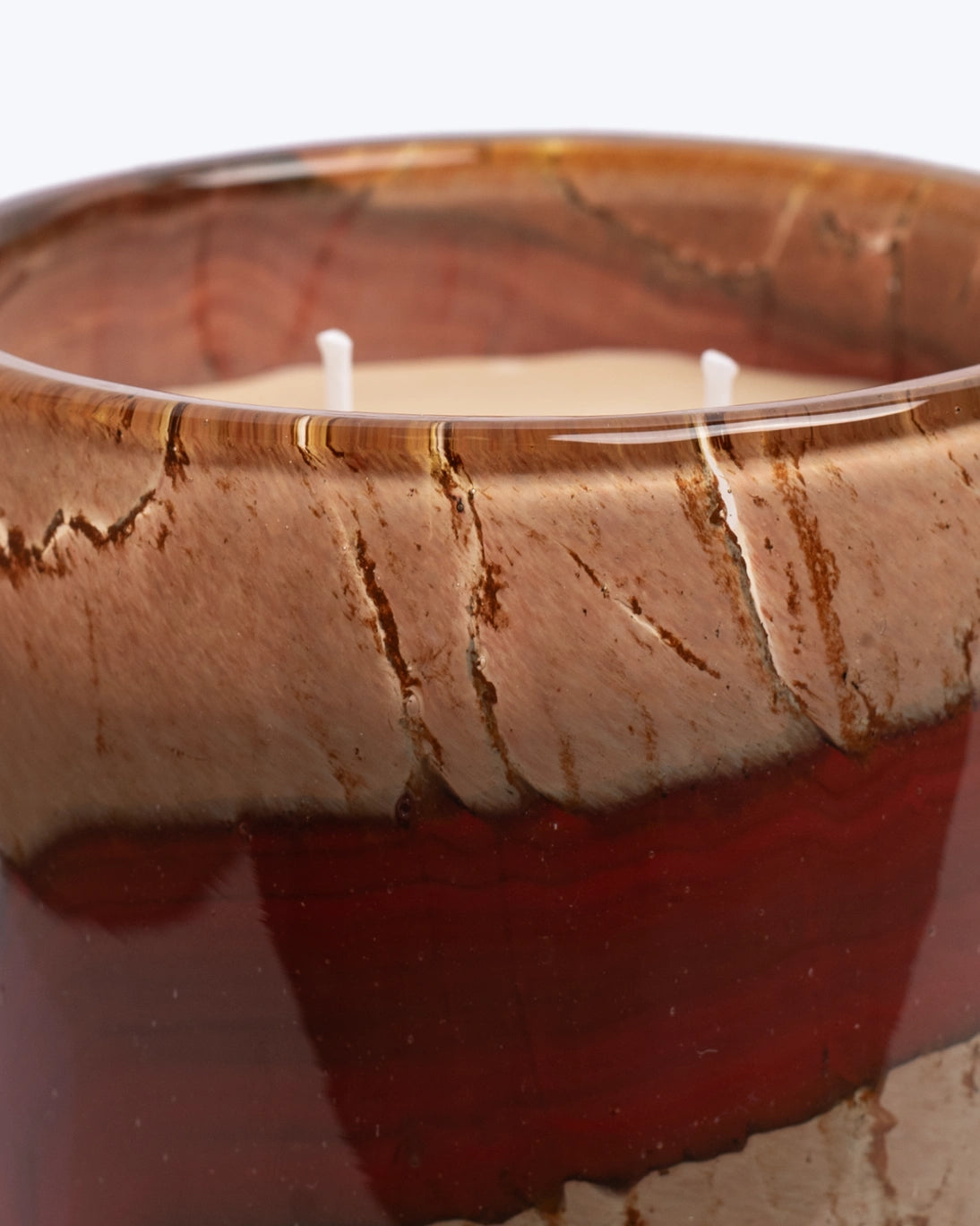 Vela aromática artesana en recipiente cilíndrico de cristal marmoleado en tonos tierra rojizos.