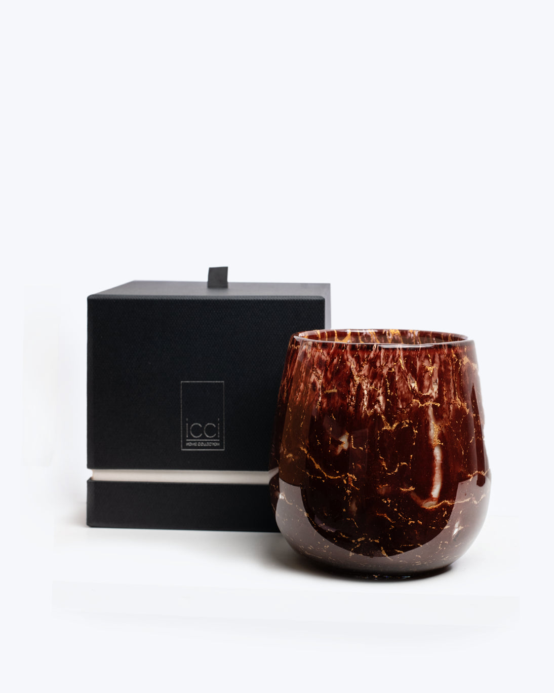 Vela aromática artesana en recipiente de cristal marmoleado en granate y dorado.