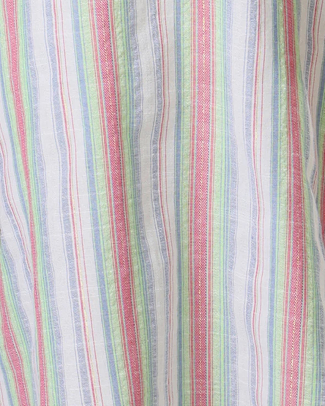 The Glee Dress by Traffic People. It exudes a casual summer vibe thanks to its multicolored stripe pattern in blue, red, and white tones, making it easy to wear and pair.