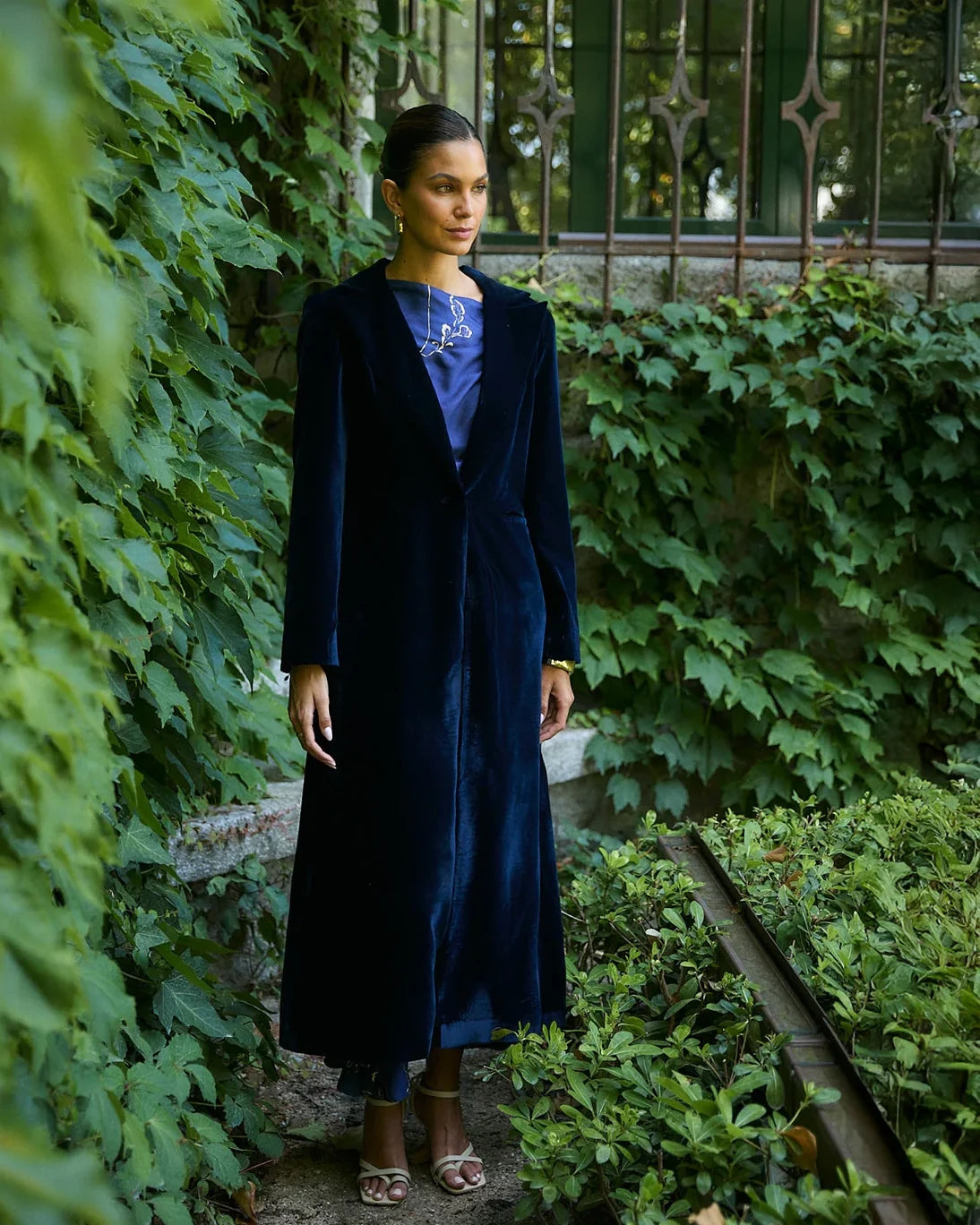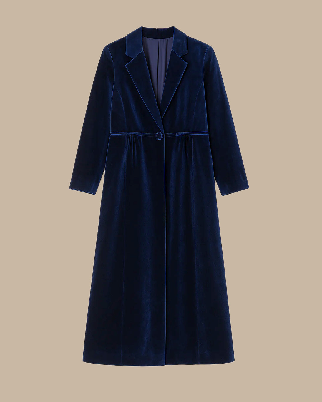 Abrigo largo confeccionado en suave terciopelo de color azul oscuro.Su diseño elegante tiene unas solapas clásicas tipo blazer y un cierre frontal con un único botón a la altura de la cintura, que le da un acabado estructurado y sofisticado.