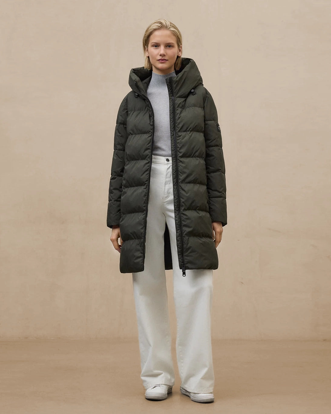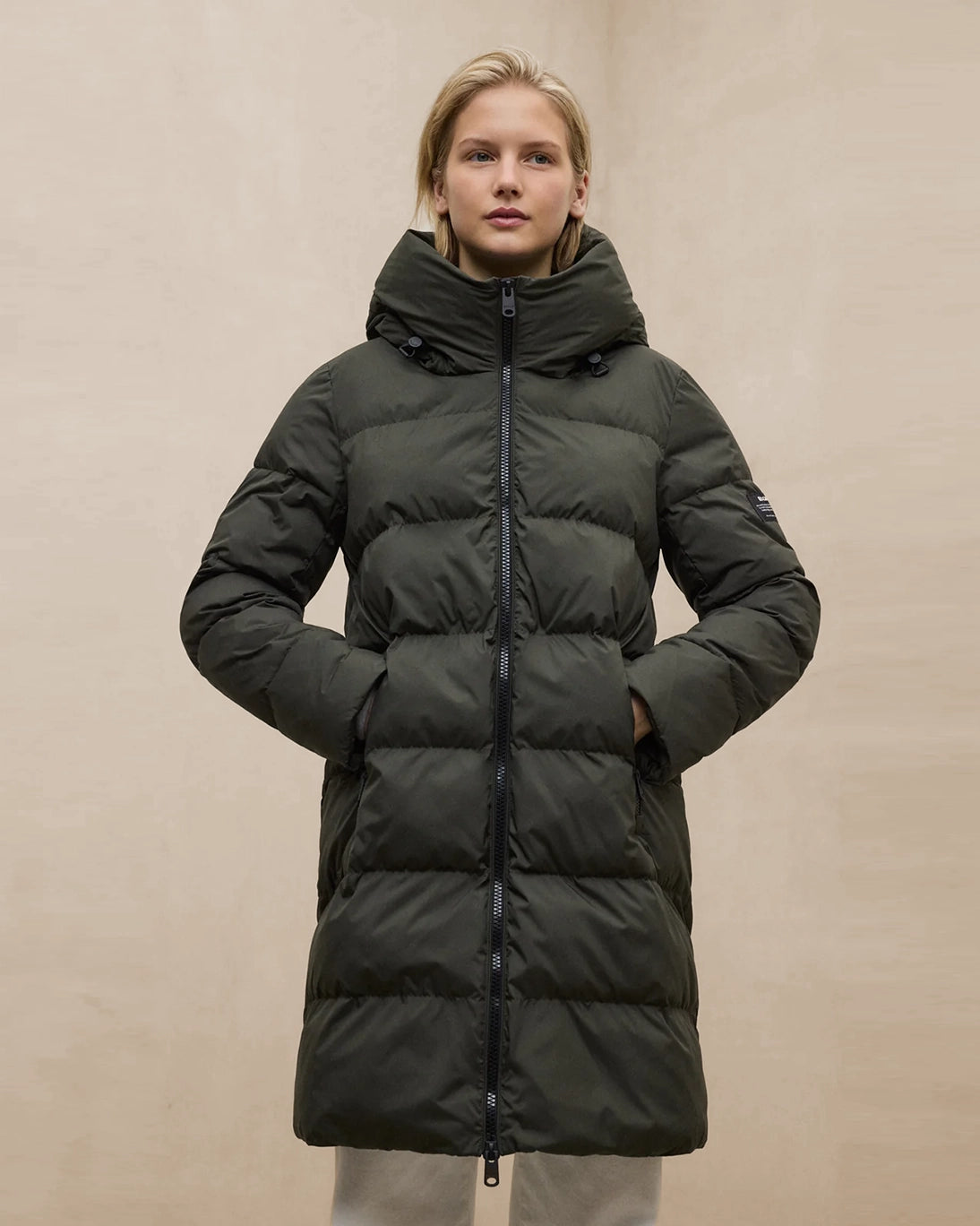Abrigo de plumas negro Manlie de la marca Ecoalf. Ofrece una calidez ligera y eficiente sin comprometer el confort ni el estilo. De corte relajado y largo por encima de la rodilla, este abrigo está pensado para ofrecer libertad de movimiento y un look moderno.