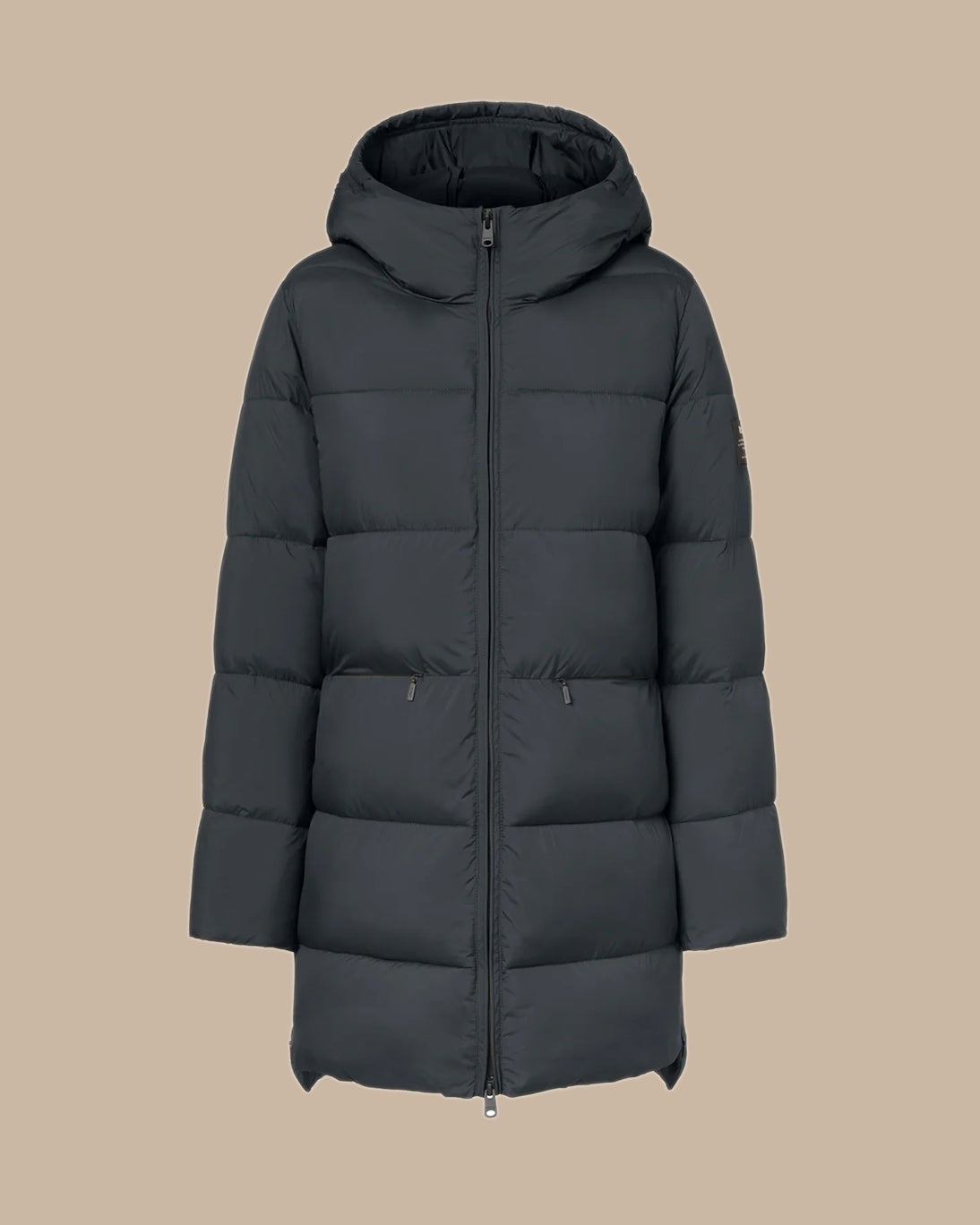 El corte es relajado y largo por encima de la rodilla. Está diseñado para ofrecer libertad de movimiento y máxima protección frente al frío. Dispone de cierre frontal con cremallera bidireccional, puños internos elásticos y capucha ajustable con topes para un ajuste perfecto. Los bolsillos horizontales con cremallera y las aberturas laterales con cierres invisibles aportan funcionalidad y un acabado limpio.