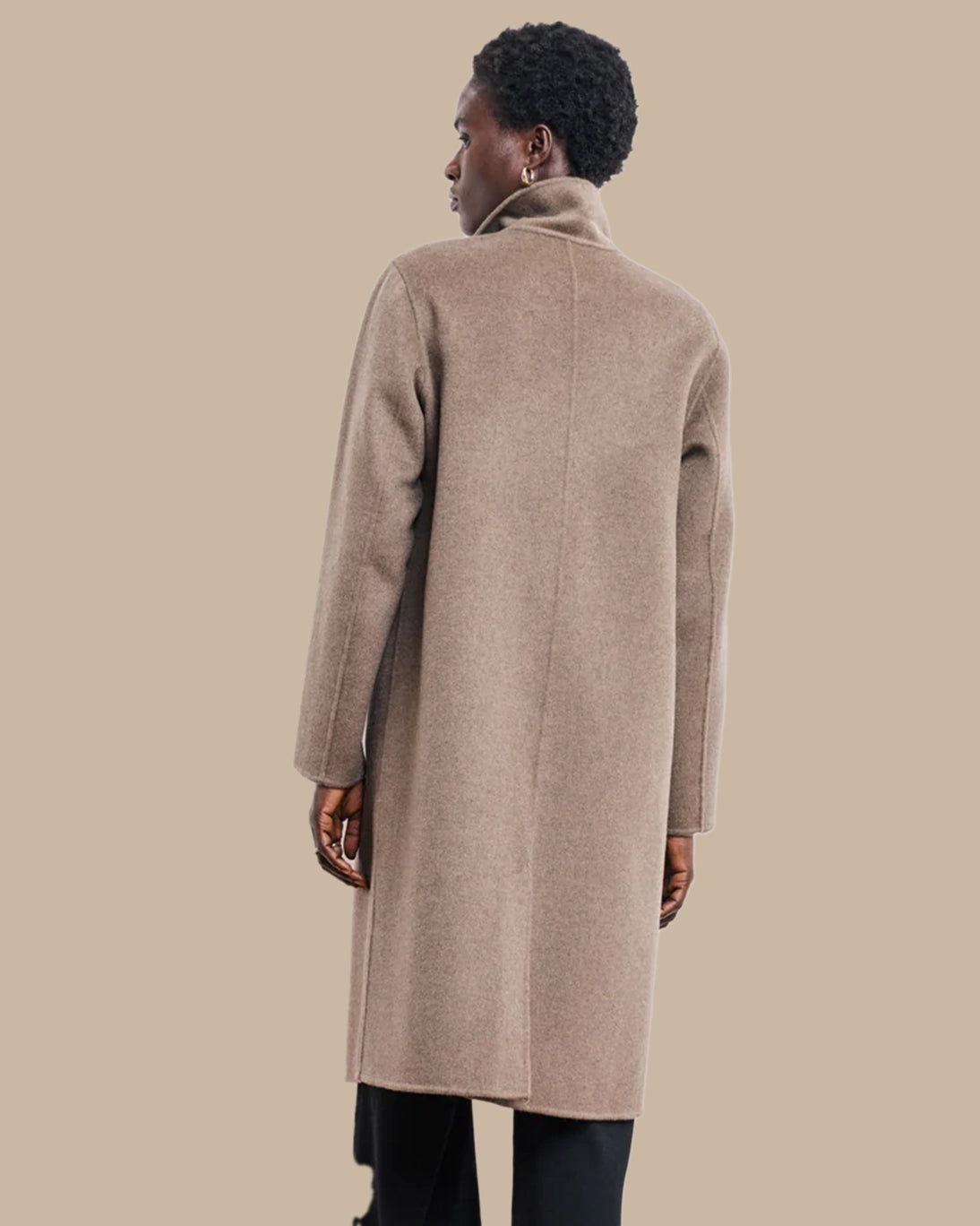 Es largo y recto y se abrocha con de tres botones. Está confeccionado en en lana de doble cara. Cuello y abertura trasera de estilo sastre. Dos bolsillos de solapa.
