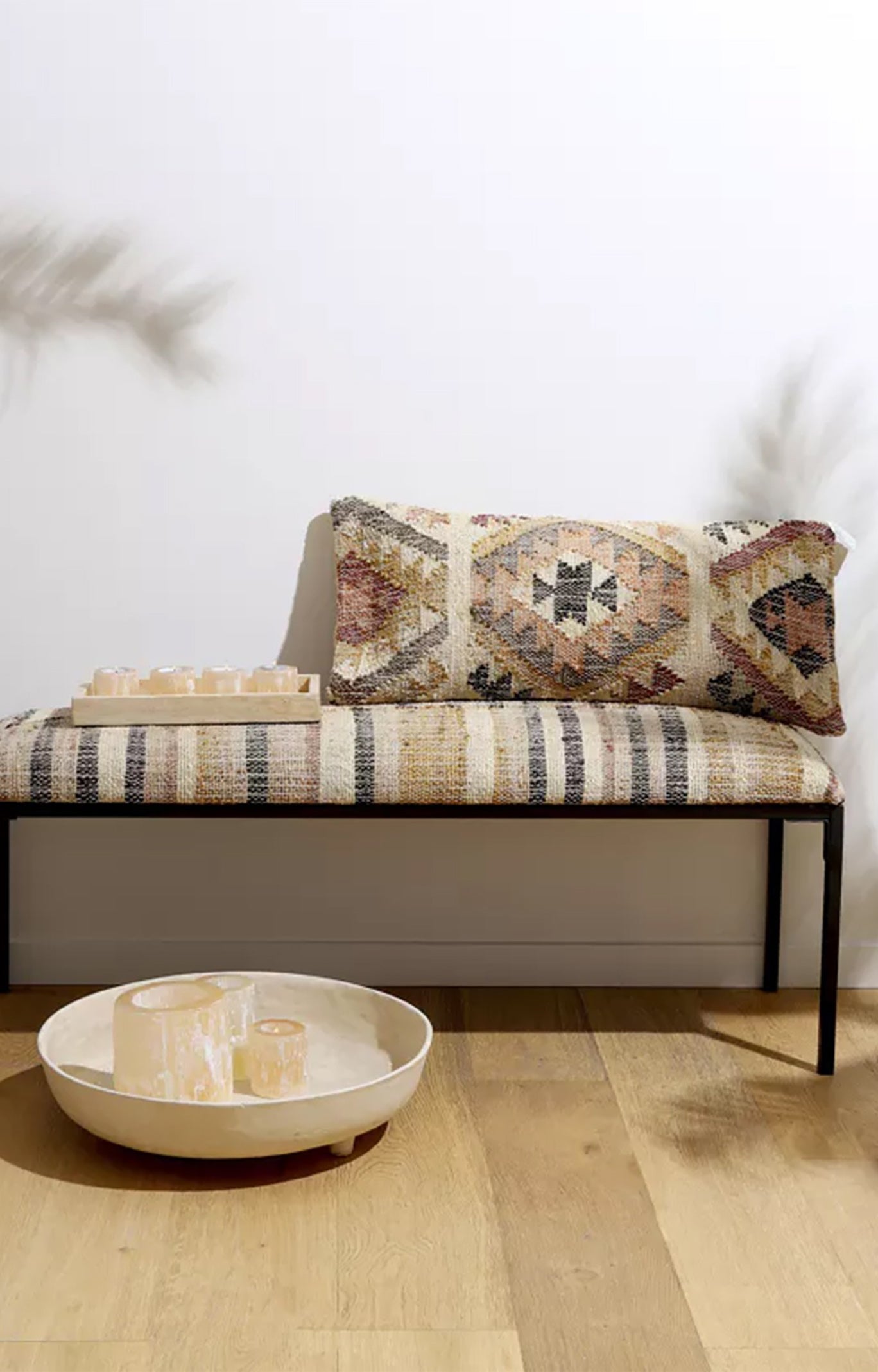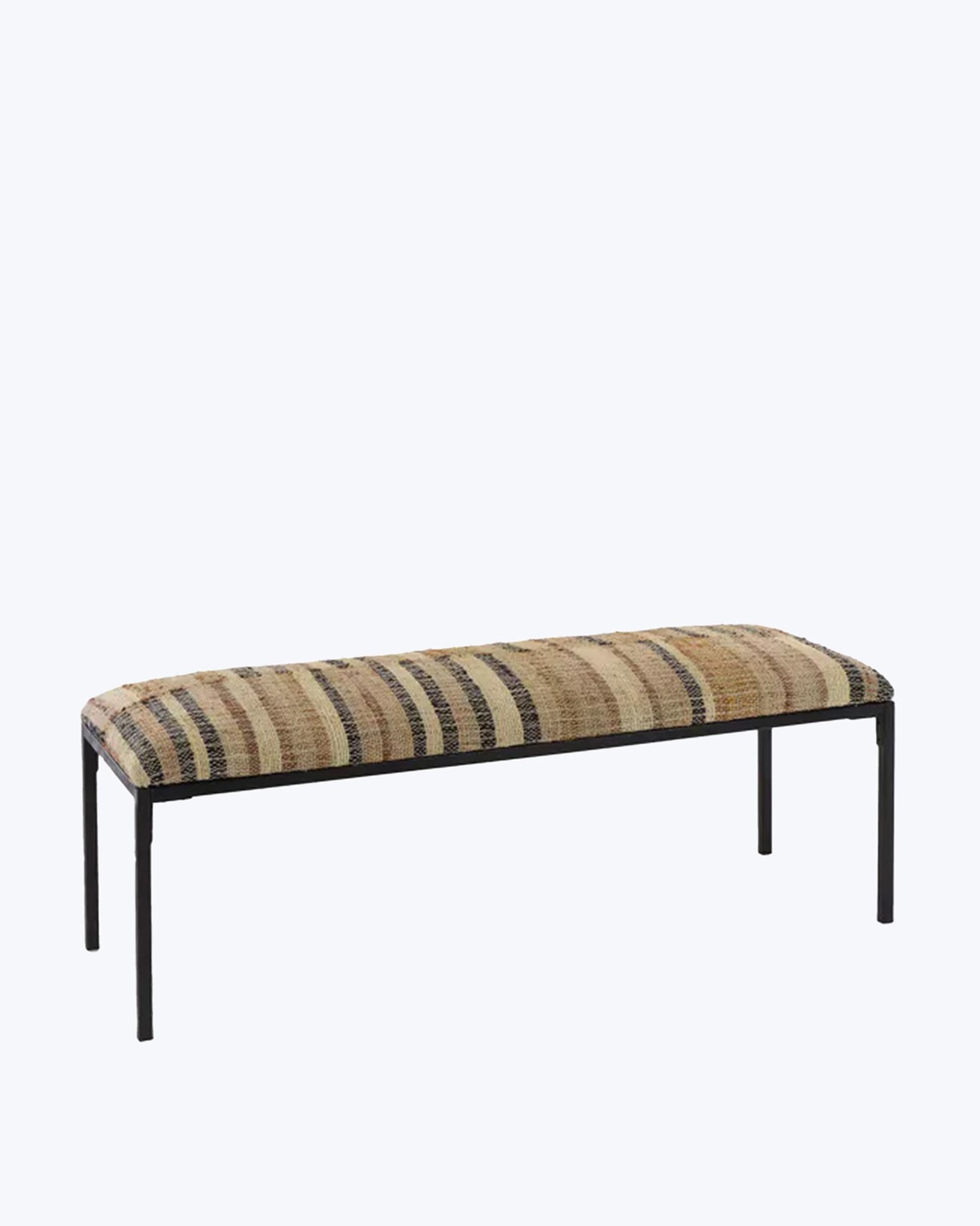 Banco de metal negro con asiento tapizado con tela de kilim tejido a mano, con rayas en tonos tierra y negro. Es el modelo Osiris de la marca Pomax.