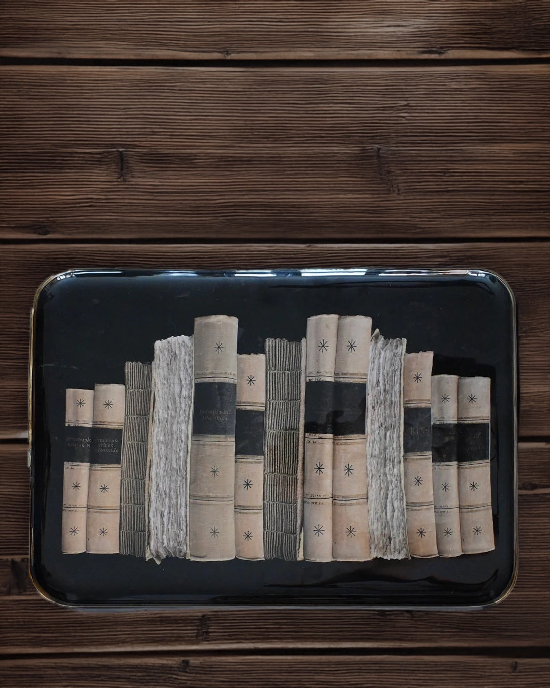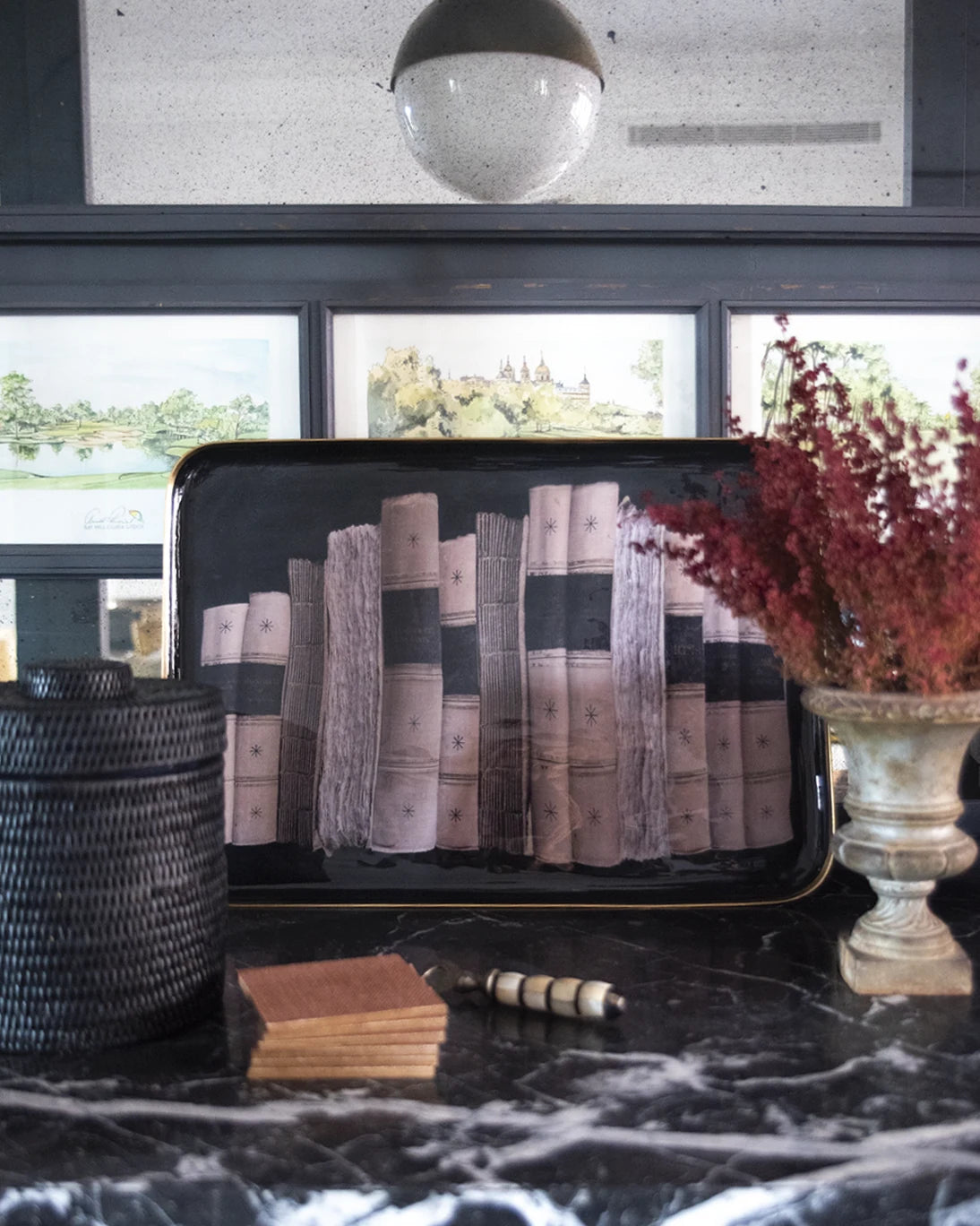 Bandeja esmaltada con fondo negro y filo dorado, con dibujo de libros dispuestos como en una librería.