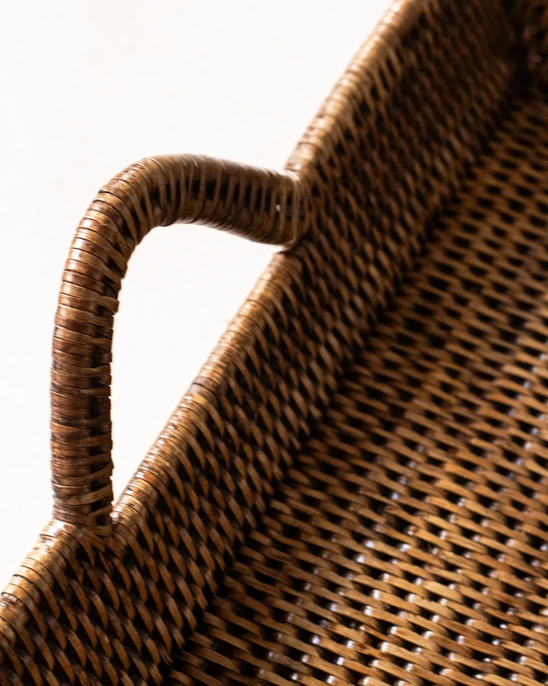 Las asas integradas en el mismo material facilitan su transporte, mientras que su trenzado artesanal resalta la textura orgánica y el encanto atemporal del ratán.
