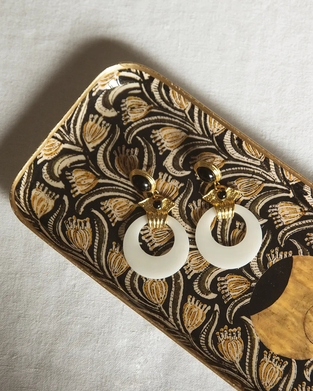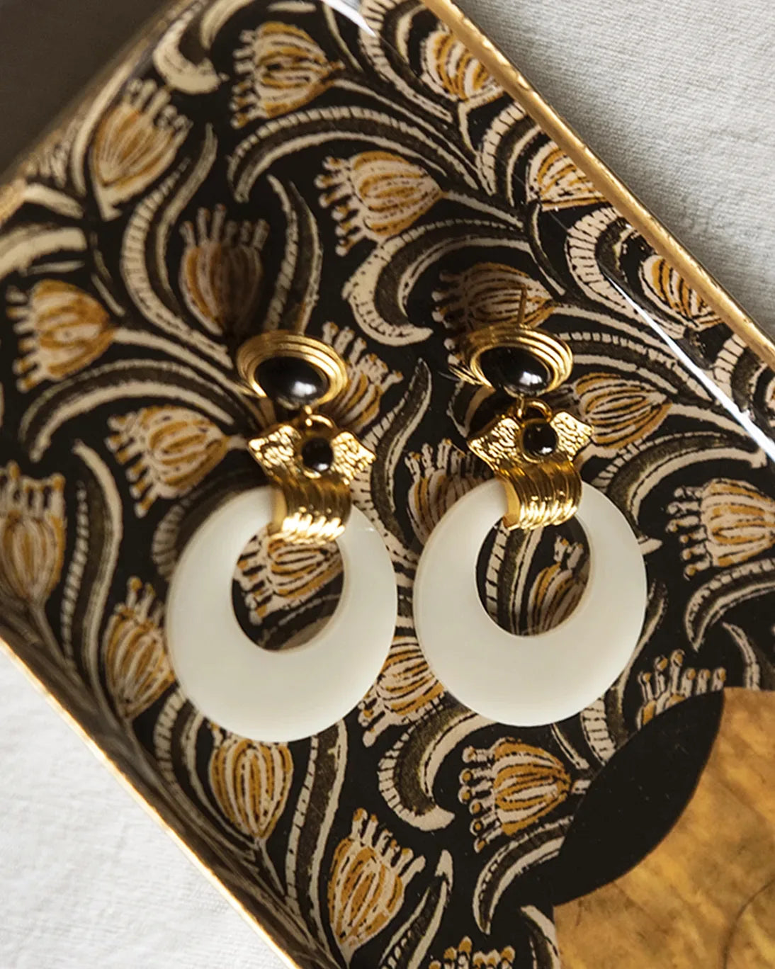 Bandeja esmaltada alargada con fondo negro, filo dorado y un estampado de flores en tonos amarillos.