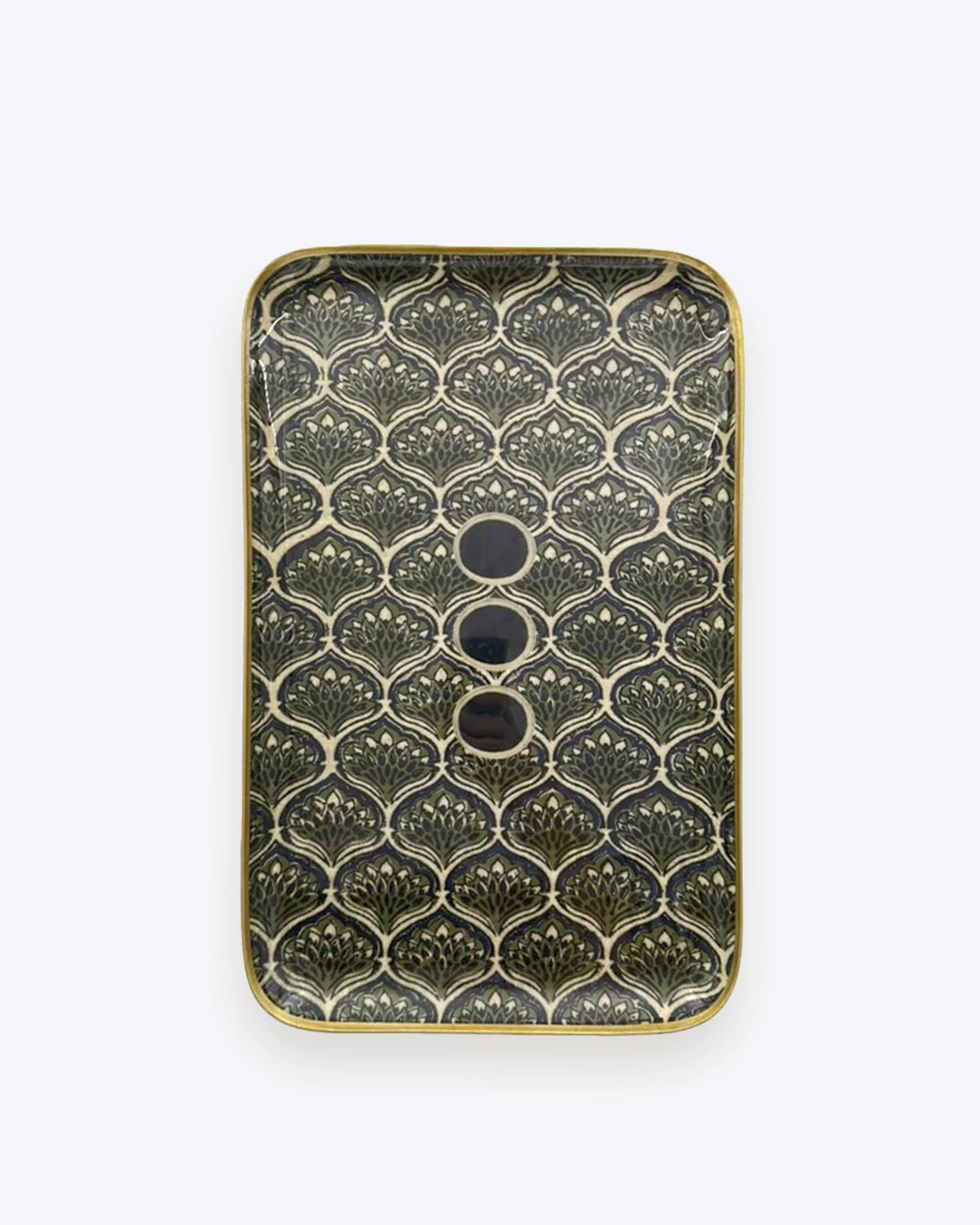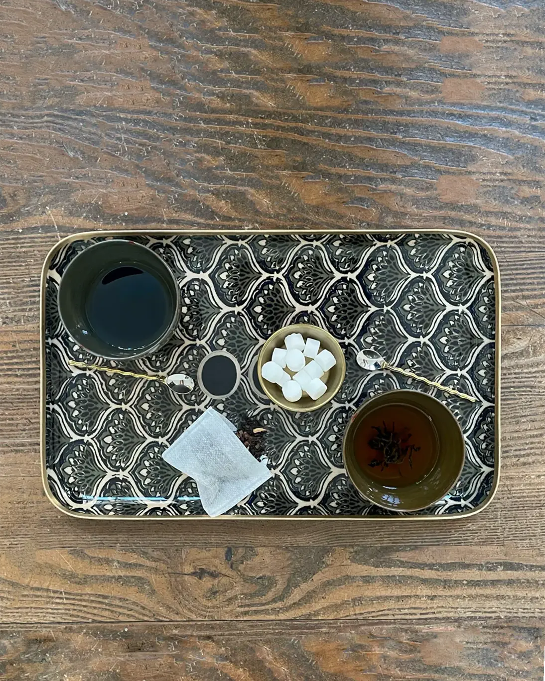 Bandeja esmaltada con fondo negro, filo dorado y un estampado de hojas en tonos verdes.