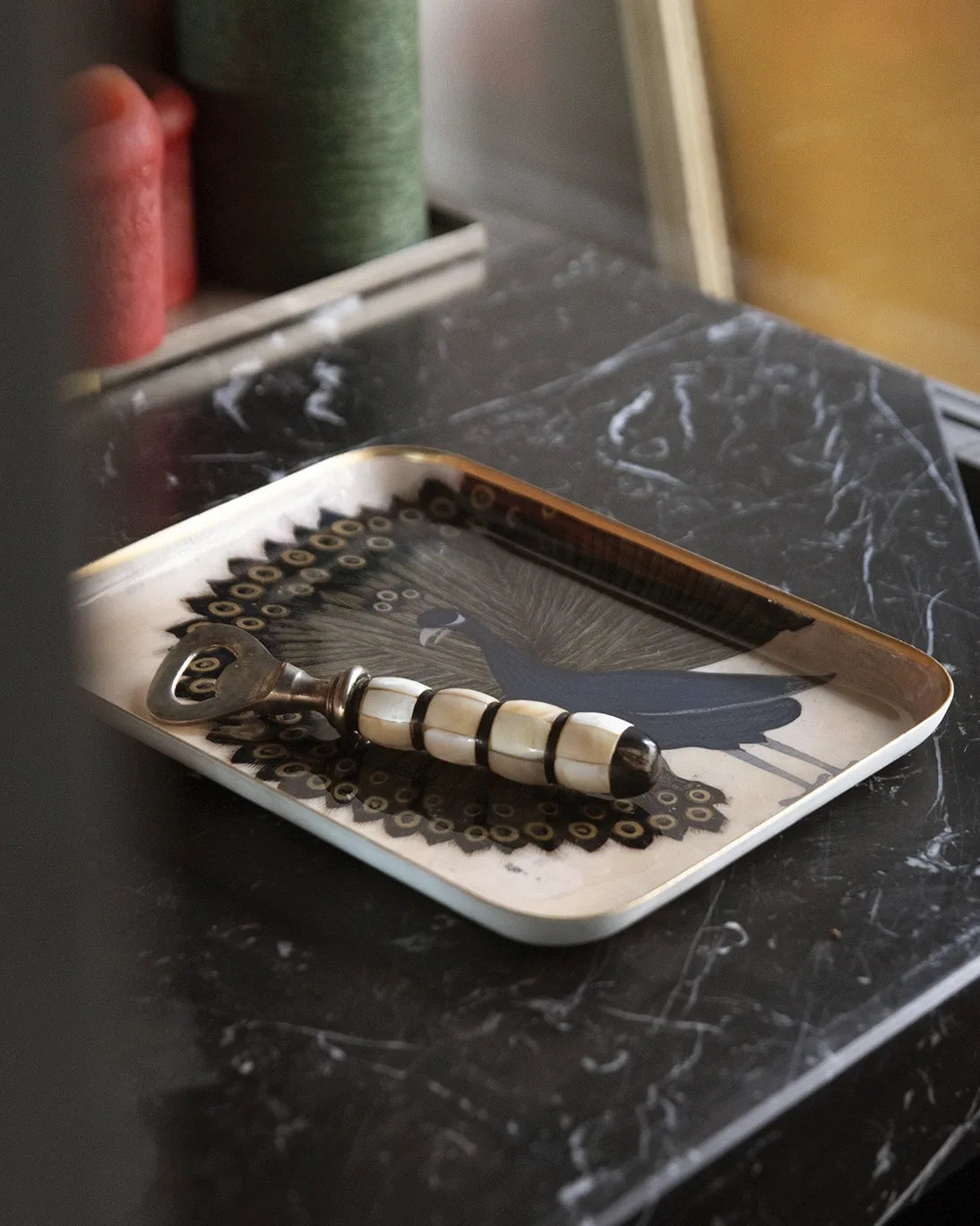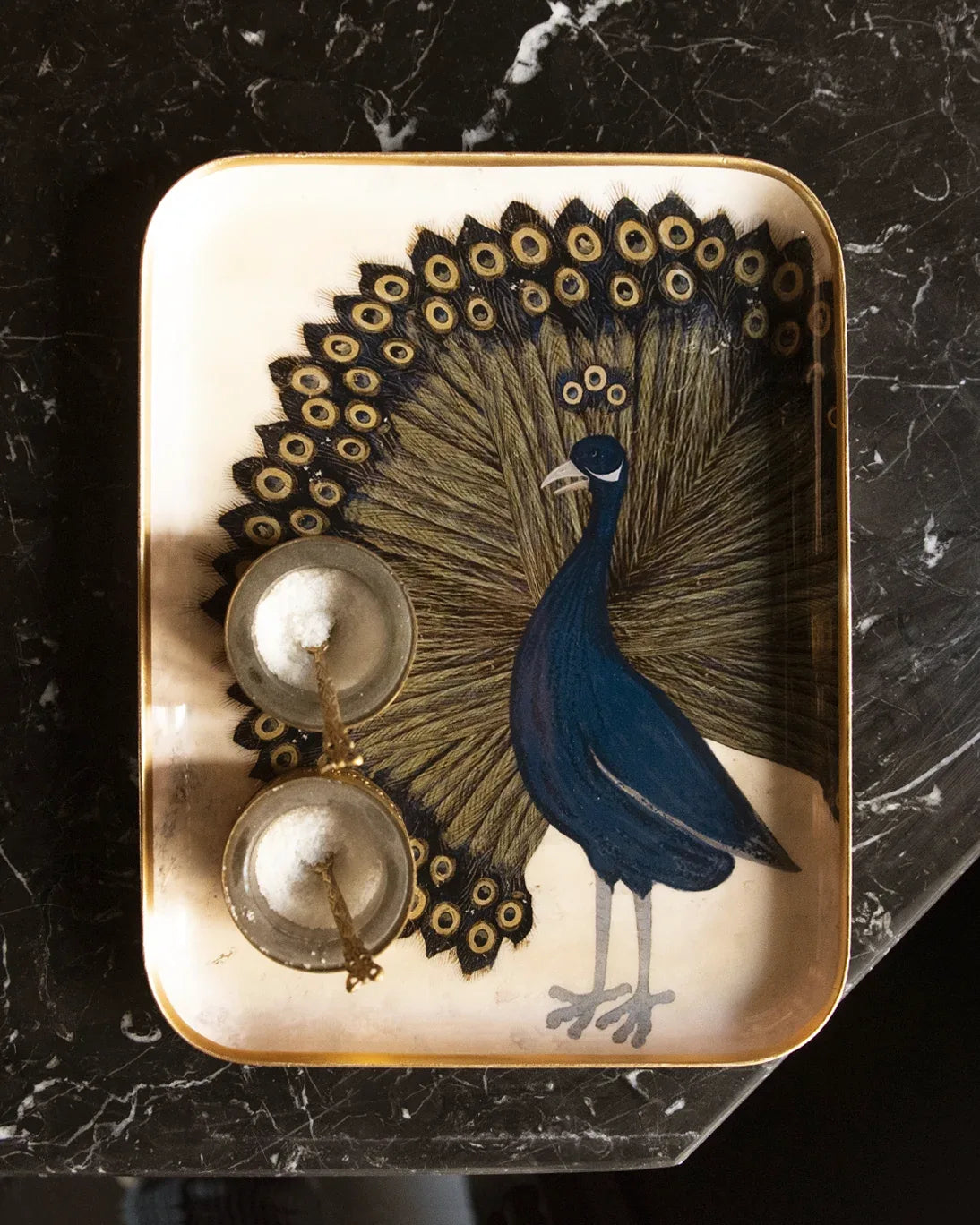 Bandeja esmaltada con un bonito pavo real sobre fondo color hueso, con filo dorado.