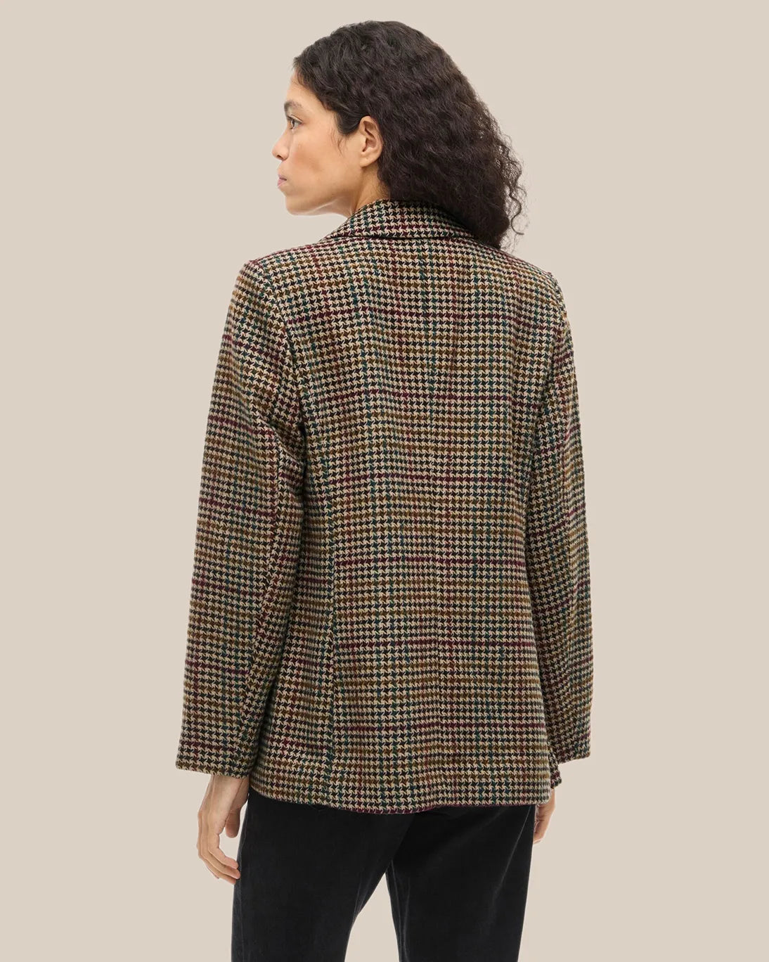 Blazer Happy de la marca Vila. El estampado es de cuadros con cierre frontal de botones, bolsillos delanteros y forro interior completo. De corte regular, ofrece una silueta equilibrada y atemporal.