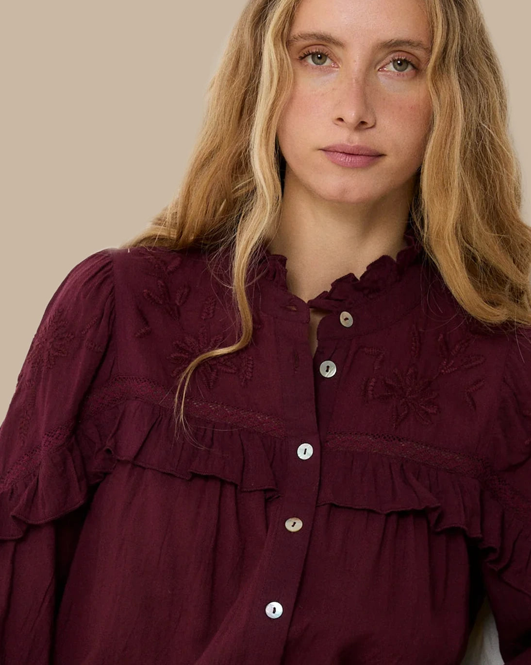 Blusa Trujillo Embroidery de Sophie & Lucie. Tiene bordados florales en canesú y volantes en el pecho y mangas. El cuello y las mangas están fruncidas y el cierre es con botones en la parte delantera.