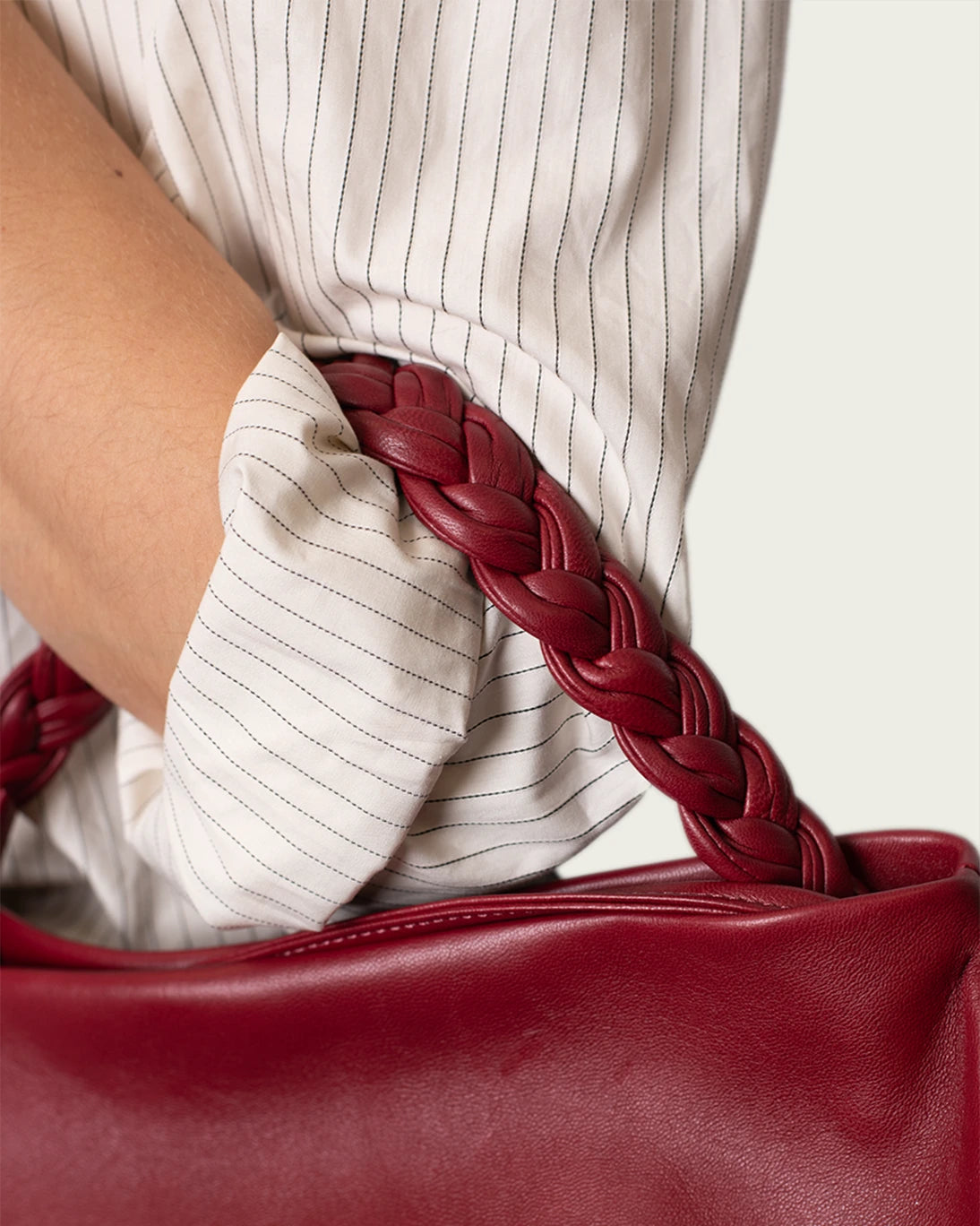 Bolso de hombro con forma rectangular y asa trenzada, de color granate.