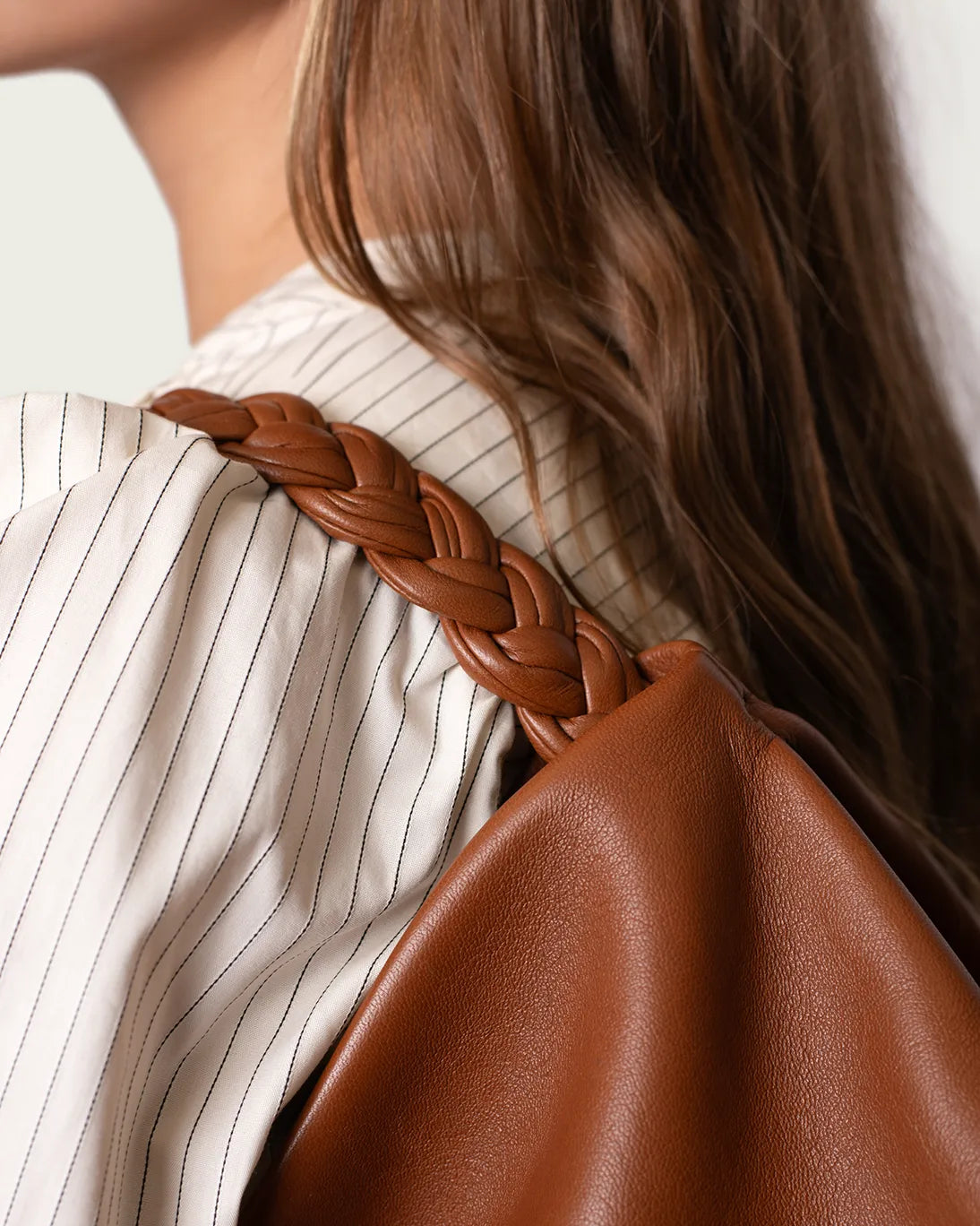 Bolso de hombro con forma rectangular y asa trenzada, de color cognac.